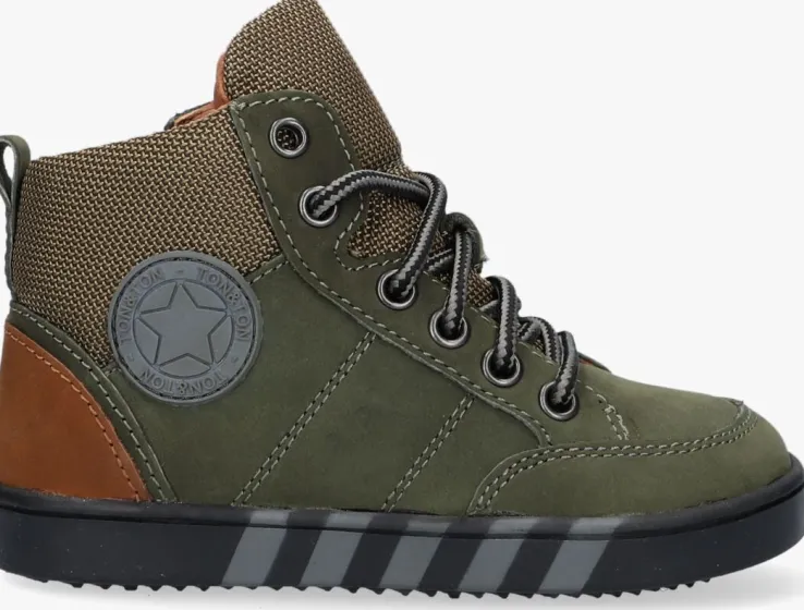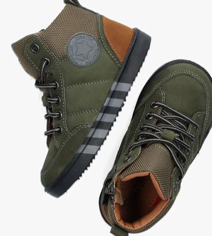 Sportief, stoer en comfy! Dat zijn de kenmerken van deze toffe hoge sneakers BRAGE uit de collectie van TON & TON. De buitenkant is uitgevoerd in groen nubuckleer met een textiele schacht en tong. De metalen veterringen en bruine leren accenten zorgen voor een unieke en stoere look. Het binnenwerk is voorzien van een leren voering met een uitneembaar voetbed. Dankzij de ritssluiting trek je het schoentje gemakkelijk aan en uit en hoef je ook niet iedere keer de veters te strikken, ideaal! De zwarte flexibele maar tegelijkertijd stevige rubberen zool zorgt voor die sportieve look en is voorzien van een gripvast profiel zodat je kleintje alle grip ervaart die hij nodig heeft tijdens alle avonturen buiten.