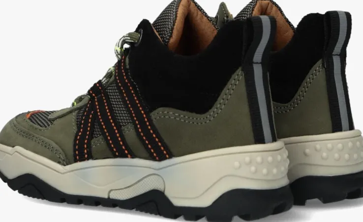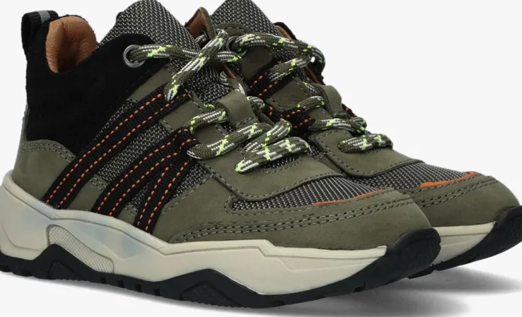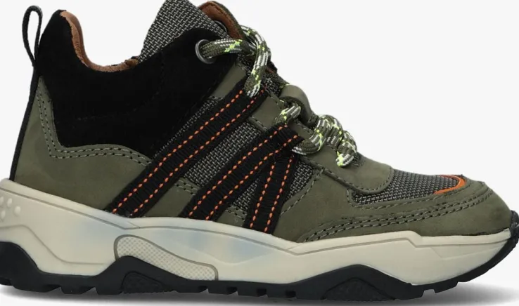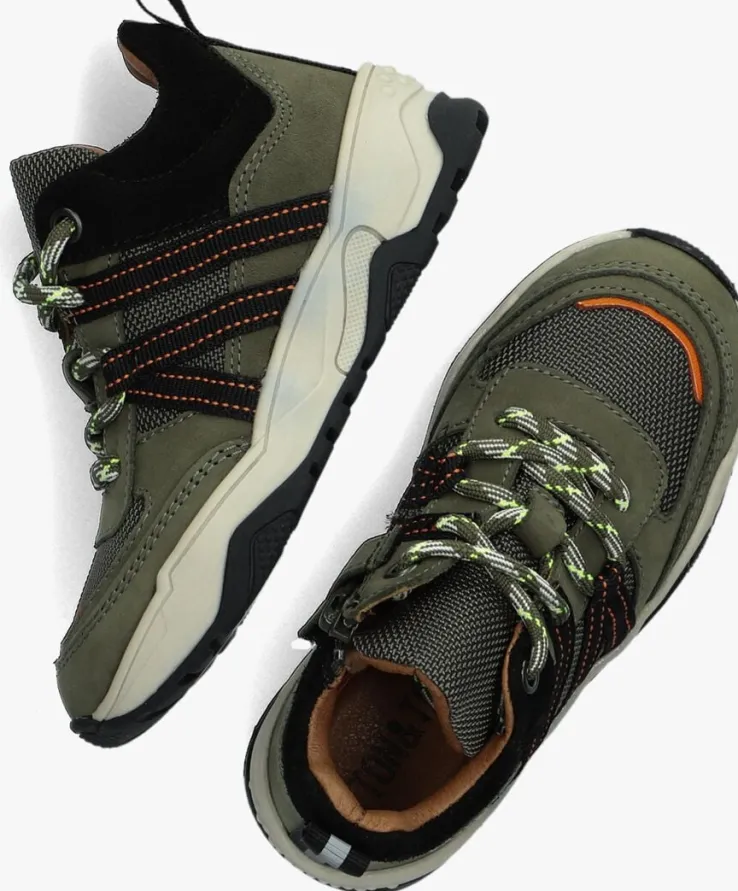 Deze hoge sneaker is van het merk TON&TON! De sneaker is uitgewerkt in groen nubuck met textiel panelen. De gevoerde enkelkraag van zwart suède zorgt voor een heerlijk comfort. Leuke details: de oranje rand bij de neus, de aantreklus bij de hiel en de gekleurde veters. De sneaker is gevoerd met bruin leer en heeft een zacht uitneembaar voetbed. De beige zool heeft een zwarte loopzool met gripvast profiel.