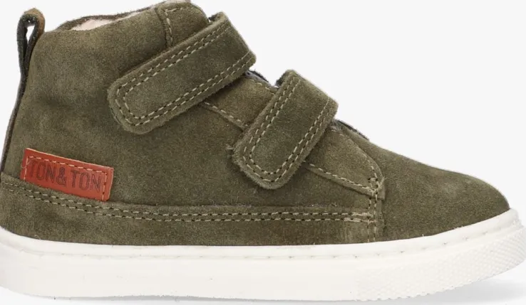 Sportief, stoer en comfy! Dat zijn de kenmerken van deze toffe hoge sneakers STEYN uit de collectie van TON & TON. De buitenkant is uitgevoerd in groensuède en de tong heeft een leren afwerking waar kleine rondjes in zijn gestanst. Dit zorgt voor een unieke en stoere look. Aan de hiel is eenleren labeltje te vinden met merkopdruk. Het binnenwerk is voorzien van een heerlijk zachte faux fur voering en een uitneembaar lederen voetbed. Dankzij de klittenbandsluiting trek je het schoentje gemakkelijk aan en uit en hoef je ook niet iedere keer de veters te strikken, ideaal! De witte flexibele maar tegelijkertijd stevige rubberen zool zorgt voor die sportieve look en is voorzien van een gripvast profiel zodat je kleintje alle grip ervaart die hij nodig heeft tijdens alle avonturen buiten.