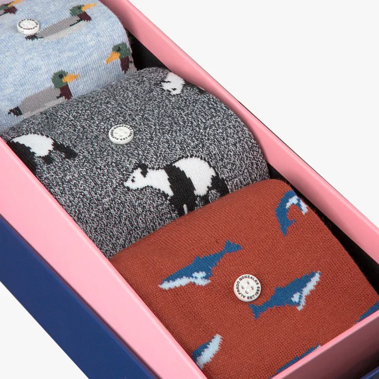 Simpelweg gezegd zijn kwaliteit, stijl enauthenciteitde kernwaarden van het merk AlfredoGonzales. Maar als je naar de mooie producten uit de collectie kijkt zal je zien dat er geen enkele moeite bespaard is gebleven bij het maken van deze creatieve uitingen in de vorm van sokken. Deze toffe box ANIMALBOXmet drie paar sokken uit de collectie van dit merkis superleuk om cadeau te geven of te krijgen en is een waar feestje voor je voeten. Zoals de naam van deze box je al doet vermoeden zijn de sokken voorzien van een toffe print van dieren. Een blauwe gemêleerdesok met eendjes, een zwart witte sok met panda’sen een roestbruine sok met een print van haaien.Elk paar AlfredoGonzalessokken zijn voorzien van een trademark button waardoor ze niet alleen herkenbaar zijn maar wat tevens zorgt voor een prachtig klein detail als toevoeging van elke outfit. Samenstelling van de sokken: 78% katoen, 18% nylon en 4% lycra.