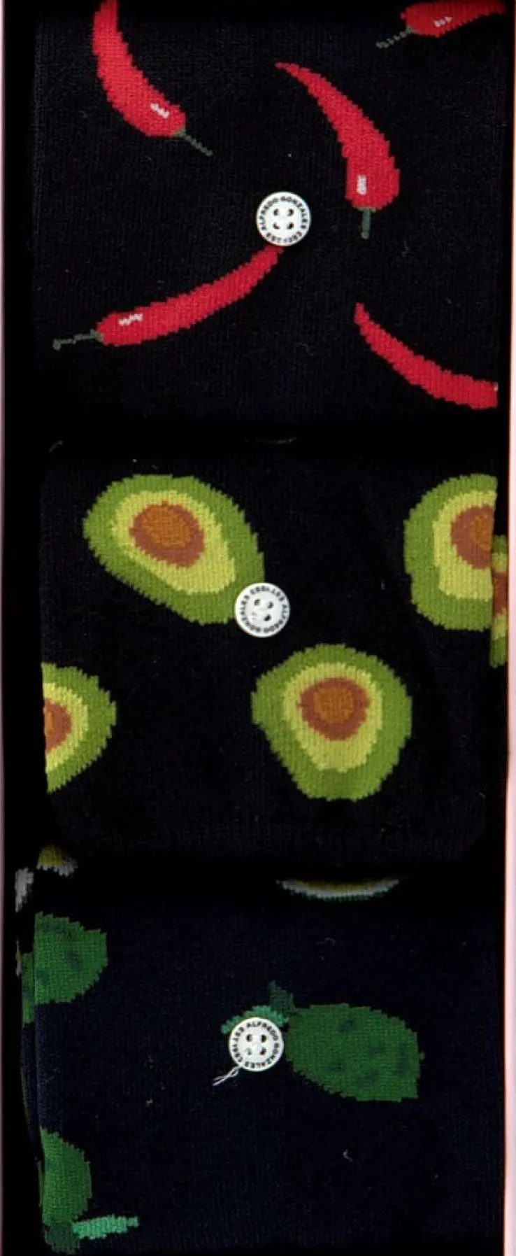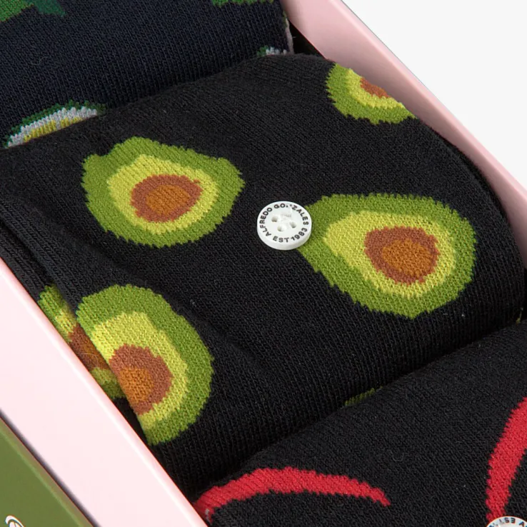 Simpelweg gezegd zijn kwaliteit, stijl enauthenciteitde kernwaarden van het merk AlfredoGonzales. Maar als je naar de mooie producten uit de collectie kijkt zal je zien dat er geen enkele moeite bespaard is gebleven bij het maken van deze creatieve uitingen in de vorm van sokken. Deze toffe box FOOD BOXmet drie paar sokken uit de collectie van dit merkis superleuk om cadeau te geven of te krijgen en is een waar feestje voor je voeten. Zoals de naam van deze box je al doet vermoeden zijn de sokken voorzien van een toffe print van lekkernijen. Een donkerblauwe sok met limoentjes en twee zwarte sokken waarvan er één met een avocado print en de ander met een rode pepertjes print. Elk paar AlfredoGonzalessokken zijn voorzien van een trademark button waardoor ze niet alleen herkenbaar zijn maar wat tevens zorgt voor een prachtig klein detail als toevoeging van elke outfit. Samenstelling van de sokken: 78% katoen, 18% nylon en 4% lycra.