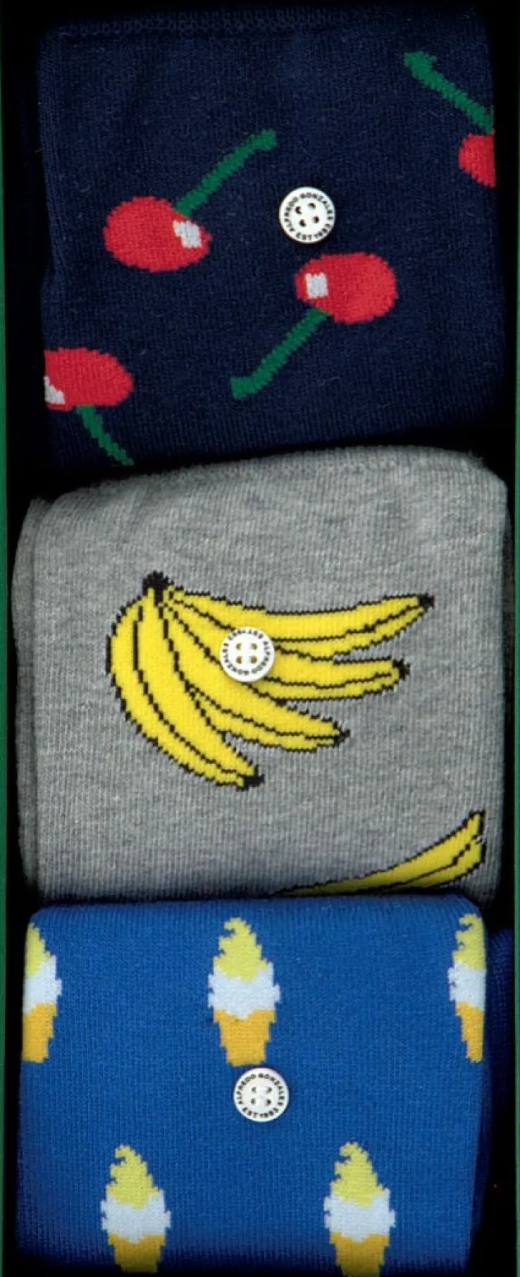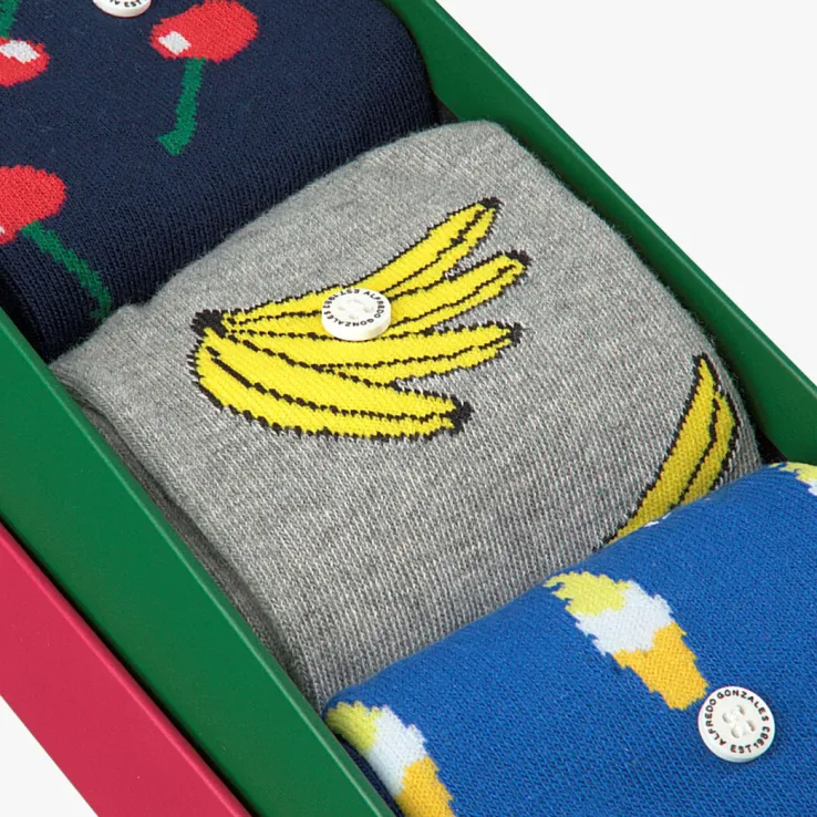 Simpelweg gezegd zijn kwaliteit, stijl enauthenciteitde kernwaarden van het merk AlfredoGonzales. Maar als je naar de mooie producten uit de collectie kijkt zal je zien dat er geen enkele moeite bespaard is gebleven bij het maken van deze creatieve uitingen in de vorm van sokken. Deze toffe box FOOD BOXmet drie paar sokken uit de collectie van dit merkis superleuk om cadeau te geven of te krijgen en is een waar feestje voor je voeten. Zoals de naam van deze box je al doet vermoeden zijn de sokken voorzien van een toffe print van lekkernijen. Een donkerblauwe sok met rode kersjes, een grijze sok met bananen en een blauwe sok met een print van softijsjes.Elk paar AlfredoGonzalessokken zijn voorzien van een trademark button waardoor ze niet alleen herkenbaar zijn maar wat tevens zorgt voor een prachtig klein detail als toevoeging van elke outfit. Samenstelling van de sokken: 78% katoen, 18% nylon en 4% lycra.