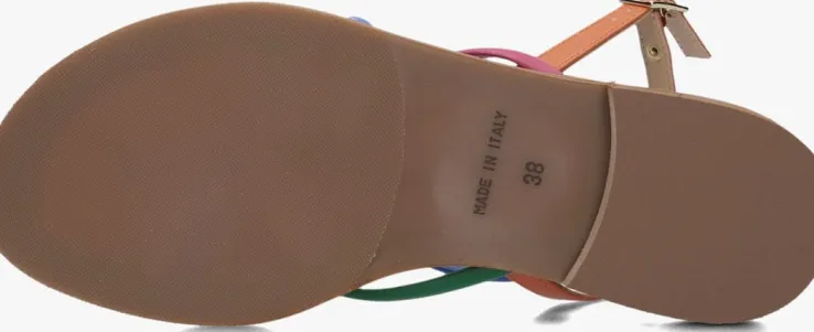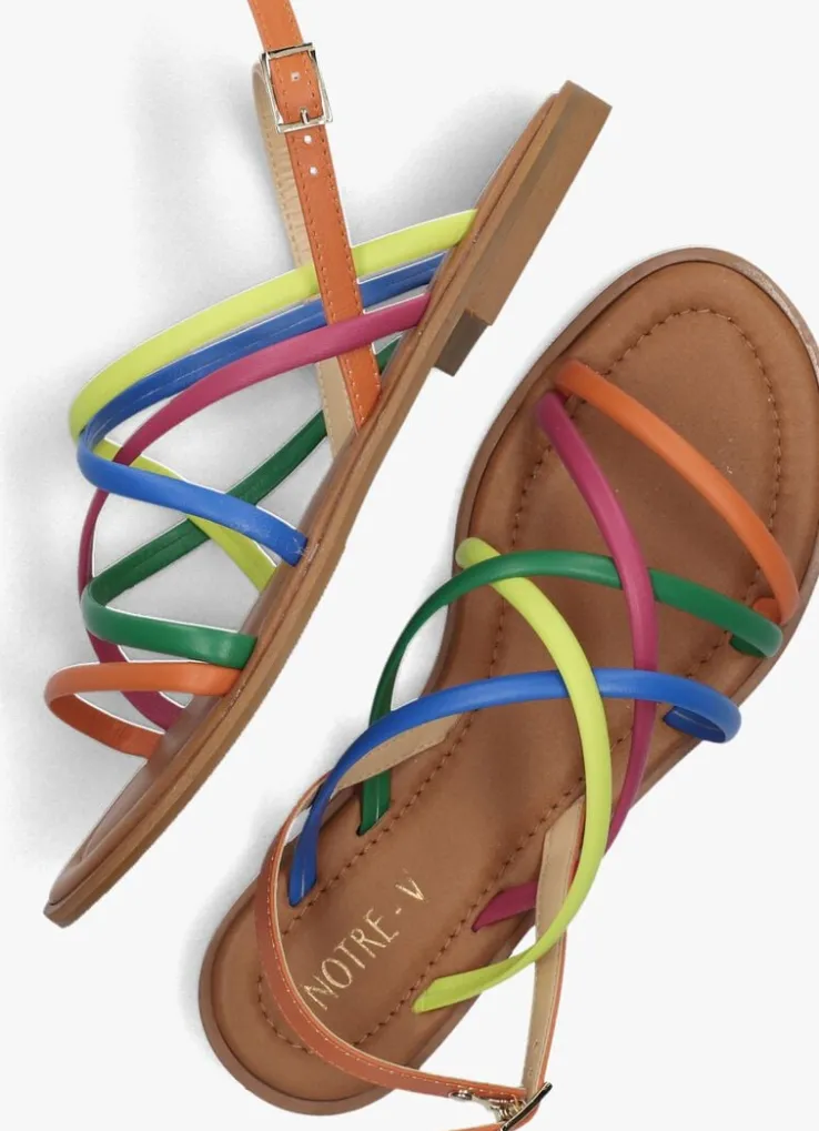 Stap in stijl met deze multi-kleurige sandalen van NOTRE-V. Met de 22637 ben jij klaar voor elke zomerse dag! De sandaal heeft multi-kleurige gekruiste bandjes op de wreef en met het oranje hielbandje met goudkleurige gespsluiting maak je de sandaal passend aan de voet, stap je gemakkelijk in de zachte leren binnenvoering. De zool is van rubber en heeft een comfortabele en gripvaste ondergrond. Combineer ze met een luchtige zomerjurk voor een casual look of draag ze onder een trendy jeans voor een avondje uit. Met deze sandalen ben jij helemaal on-trend en klaar om te stralen!