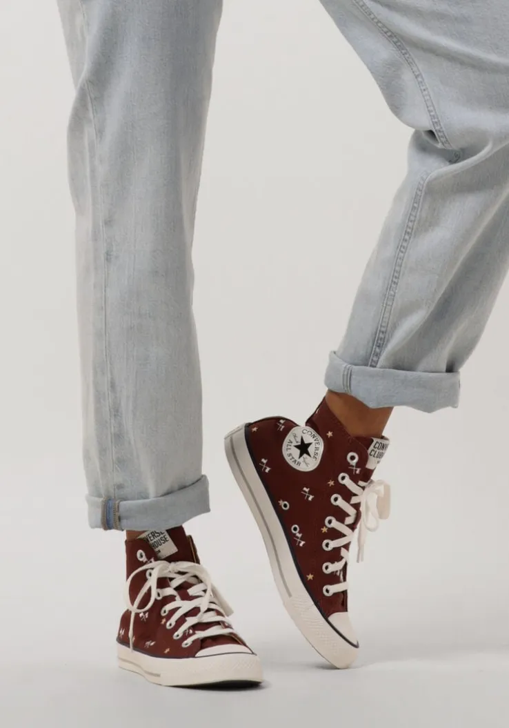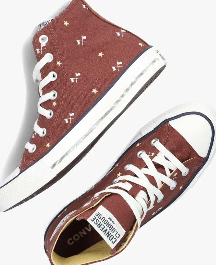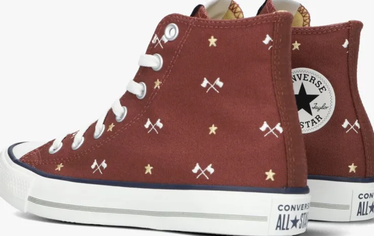 De CHUCK TAYLOR ALL STAR HI is de meest iconische hogesneaker van het merk ConverseAll Star! Deze groene klassieker is perfect om jouw persoonlijke stijl mee te laten zien en is eindeloos te combineren bij al jouw zomerse outfits. Het bovenwerk is uitgevoerd in rood canvas en heeft over het gehele bovenwerk vlaggetjes en goudkleurige sterren. De rubberen neus en stootrand geven samen met de lijnen in de zool, de kenmerkende Converse-look. Extra leuk is de suède merkpatch op de zijkant.De schoen is gevoerd metcanvas en een heeftvast voetbed en de zool is gemaakt vanrubber met een grof profiel.