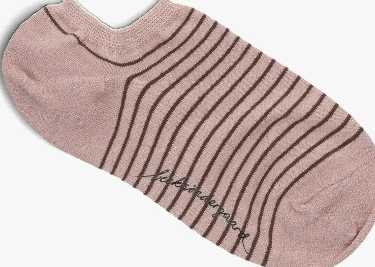 Deze roze glitter sokken bevatten bruine strepen en bestaan uit 50% katoen, 20% metallic, 20% polyester en 5% elastaan.