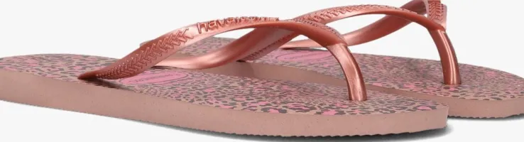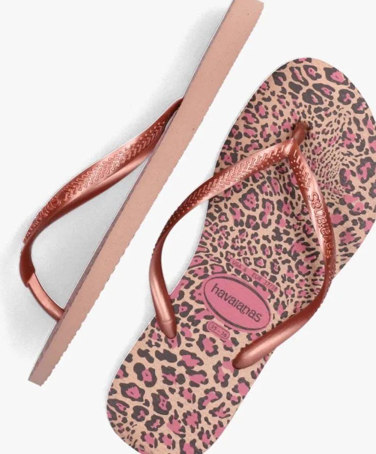 Een absolute zomer must-have van het Braziliaanse merk Havaianas; dat is deze zomerse KIDS SLIM ANIMALSslipper. Van dit rozeexemplaar word je spontaan vrolijk! De rozebandjes zijn voorzien van een reliëf merkopdruk.Het voetbed is afgewerkt met een trendy animalprint in de kleuren zwart, bruin en roze. De slipper is comfortabel, duurzaam, lichtgewicht, anti-slip, hittebestendig én waterresistant. Wat wil je nog meer? Dat de zon schijnt en jouw kindze de hele dagkan dragen natuurlijk!*Let op: Naast de Braziliaanse maat staan er op de slipper nog 2 maten, namelijk de Amerikaanse (USA) en de Europese (EUR). Wij gebruiken de omcirkelde Braziliaanse maat, die onder het logo of onderaan de slipper staat.