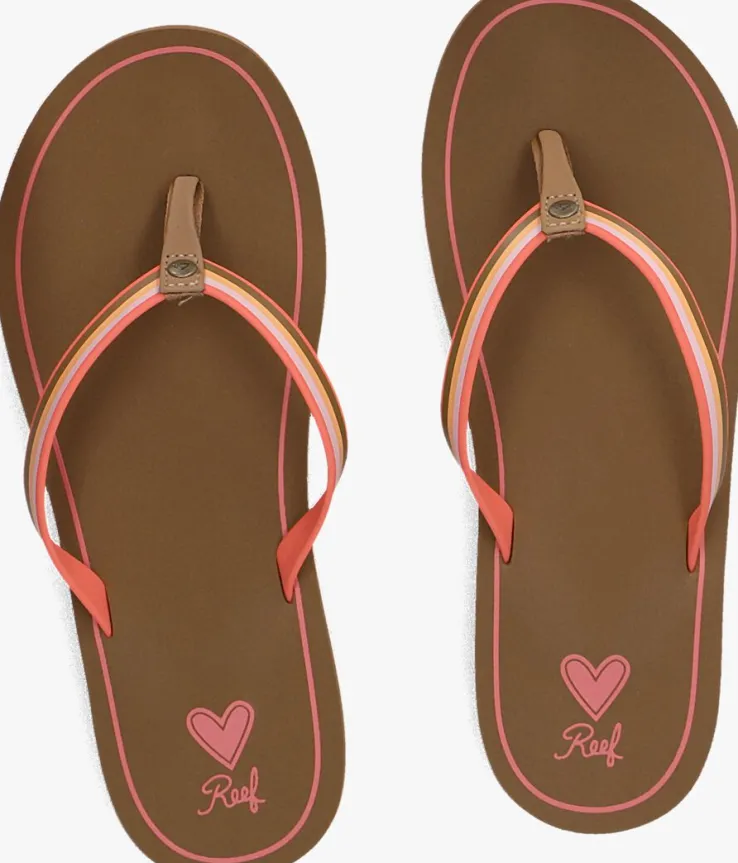 Ga naar het strand met dit slippertje DEVY uit de collectie van het bekende merk REEF. De bandjes zijn gemaakt van rubber met een bruine, oranje, roze en koraal kleur. Het teenstuk van textiel maakt dit model extra comfortabel. Het zachte voetbed is afgewerkt met een roze lijn, deze kleur komt ook terug in de loopzool die van uitstekende grip is voorzien.