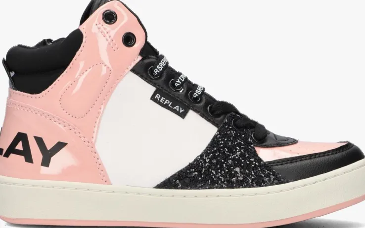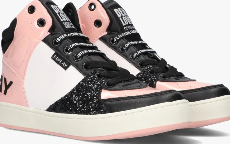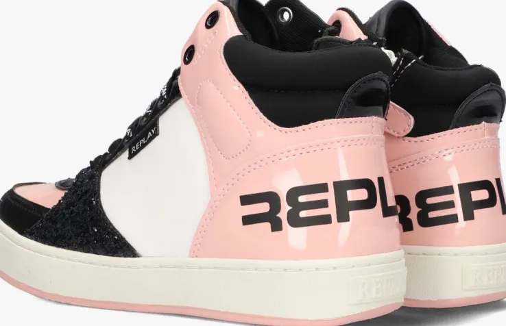 Met deze eyecatcheraan je voeten val je zeker op! En daarnaastzit deze hoge sneaker COBRA van het merk REPLAY ook nog eens heerlijk. Dit model is gebaseerd op traditionele hoge basketbalschoenen en voorziet jouw outfit van een sportieve look. Het bovenwerk is uitgevoerd in in wit, zwart en roze leatherlook met panelen van lak, neopreen en super toffe glitters. De extra hoge tong is voorzien van een rubber merklabel, op de hiel is een oversized merkopdruk te vinden en op de zijkant bevindt zich een textiel merklabeltje. De witte, rubberen kuipzool heeft een fijn profiel met een goede grip en daarnaast trek je de sneaker gemakkelijk aan met de ritssluiting aan de zijkant. Naast de zwarte veters wordt er ook paar veters met merkopdrukken geleverd, zo kun je afwisselen! De voering is gemaakt van ademend mesh en de sneaker heeft een vast voetbed van dempend memory foam voor extra comfort. Draag deze stoere sneakers met veel zelfvertrouwen onder je favoriete jeans of rokje.