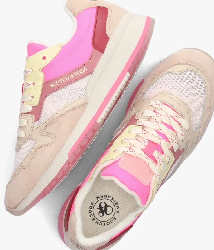 Met de lage roze sneakers VIVI van SCOTCH & SODA ben jij helemaal on-trend! Dit heerlijke seizoen verdient een vrolijke sneaker! Ga voor dit roze met beige model VIVI uit de collectie van het Amsterdamse couture-merkSCOTCH & SODA. De buitenkant is gemaakt van textiel met beige, roze en gele overlays van suède, leer, leatherlook en geribbelde nylon. Opvallende details zijn het geribbelde hielstuk, het roze merkpatch op de tong en deplatte tweekleurige veters.Het binnenwerk is gevoerd met meshtextiel en heeft een uitneembaar voetbed. De witte oplopende rubberen zool is voorzien van een ribbeltextuur en een roze accentstreep op de zoolrand en een loopzool van opgedeelde vlakken wit en roze rubber met een gripvast profiel.