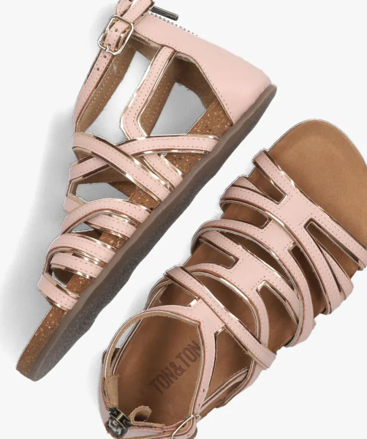Op dit lieve sandaaltje zie je je dochtertje toch al uren spelen? Dit comfortabele en trendy model VALENTINA van het merk TON & TON ziet erté gek uit en heeft ook nog eens een heel fijn voetbed van licht gevoerd suèdelook met een kurkentussenzool die veel demping biedt. Het sandaaltje is uitgevoerd in roze leatherlook met goudkleurige biezen over het gehele bovenwerk. Je maakt ‘m goed passend met het enkelbandje die voorzien is van een gespje en het dichte hielstuk heeft een ritssluiting, zo wordt aan- en uittrekken een makkie. De voering is gemaakt van zacht suèdelook en in combinatie met de rubberen loopzool die heerlijk mee buigt met het voetje van jouw kleine meid zorgt dit voor een goede afwikkeling van de voet. Het fijne profiel in de loopzool geeft een goede grip voor al jullie gezellige uitjes naar de stad of op de boulevard tijdens die heerlijke vakantie.