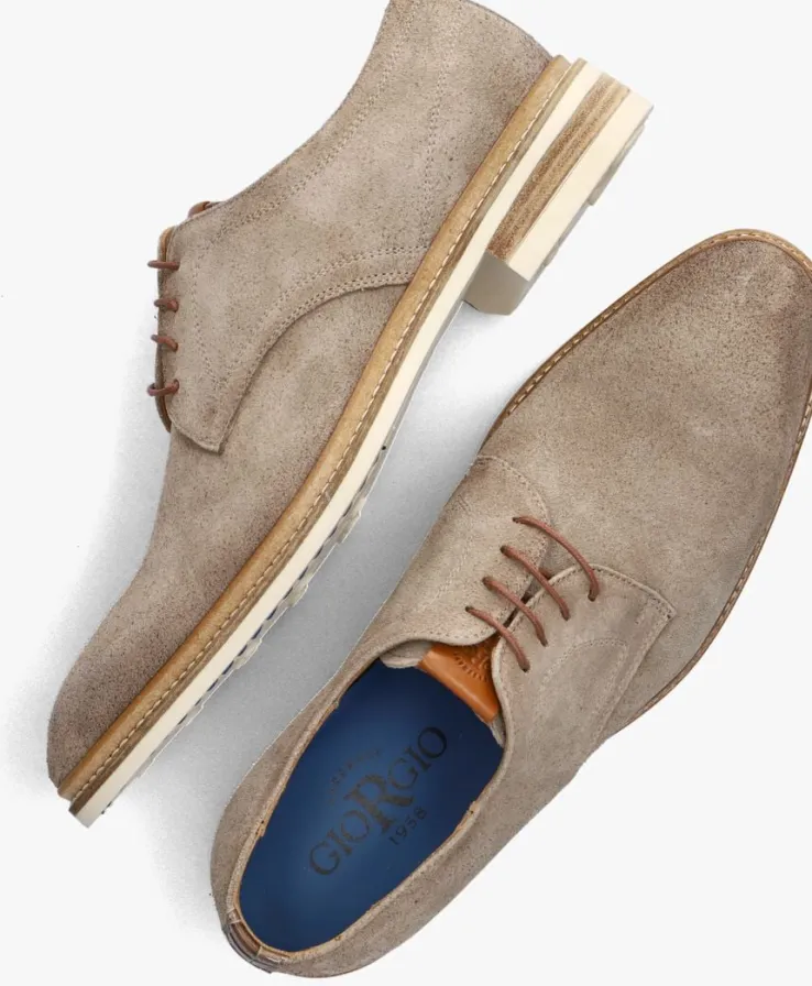 Stap stijlvol de deur uit met deze taupekleurige nette schoenen van GIORGIO. Met hun tijdloze design en hoogwaardige kwaliteit zijn ze perfect voor heren die graag elegant voor de dag willen komen. De schoenen heeft dubbel stikels en witte gestikte zoolrand voor een leuk effect. De hiel heeft een speels bewerkt patroontje. Stap gemakkelijk in de leren binnenkant met de vetersluiting, voel hoe comfortabel deze schoen is door zijn rubberen stabiele en gripvaste zool. Deze schoenen zijn ideaal voor formele gelegenheden, zoals een zakelijke meeting of een chique diner. Combineer ze met een strak pak voor een professionele look, of draag ze onder een nette broek en een overhemd voor een meer casual outfit. Met deze GIORGIO schoenen maak je altijd een goede indruk.