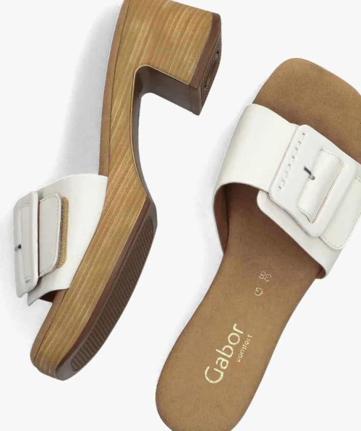 Deze muiltjes 722.3 zijn super trendy voor de zomer! Dit witte model komt uit de collectie van het merk GABOR en heeft een bovenwerk van leer met een beklede siergesp. Onder de gesp zit klittenband bevestigd, zodat hij goed aansluit aan je voet. De voering bestaat uit suèdelook en heeft een dempend voetbed. De houtlook zool maakt dit model helemaal af en het plateau onder de voorvoet is 2,5 centimeter hoog. De hakhoogte is 6 centimeter en is afgewerkt met een kunststof haktip. Dit muiltje staat je altijd goed!