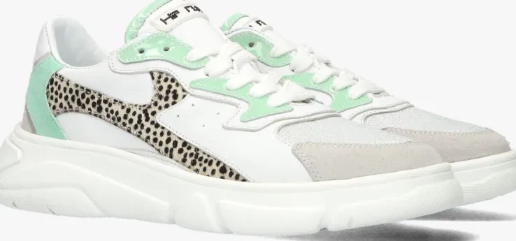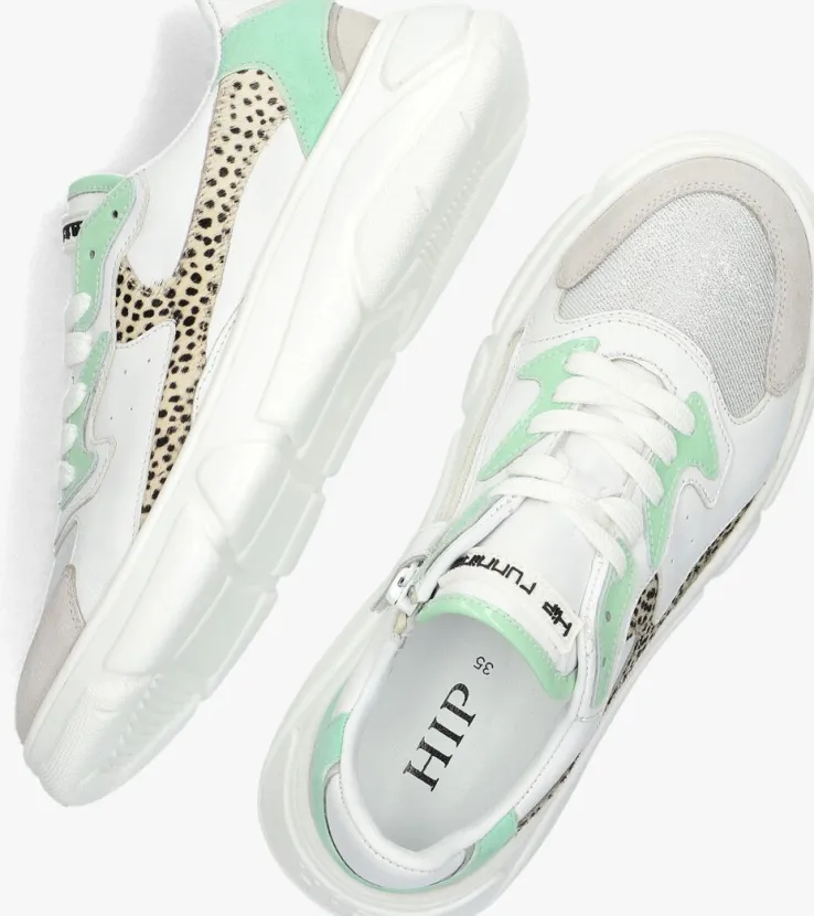 Het merk HIP heeft niet voor niks het woord ‘hip’ als merknaam. Met de schoenen uit de collectie van dit merk ben jij gegarandeerd van een hippe schoen en loop je er altijd trendy bij. Deze witte lage sneaker H1096L is uitgevoerd in wit leer met overlays van groen lakleer, groen suède, lichtgrijs suède, beige ponyhair met pixelprint en de tong is voorzien van glitter textiel. Opvallend zijn de perforaties op de zijkant, het rubberen merklabel op de tong en de rubberen accenten op de hiel. Dankzij de ritssluiting naast de vetersluiting trek je ‘m gemakkelijk aan en uit. Voor een stoere look is dit model afgewerkt met een rubberen chunky zool en een merkreliëf. Het binnenwerk is gevoerd met leer en heeft een uitneembaar voetbed. De zool is voorzien van een gripvast profiel voor een goede grip.