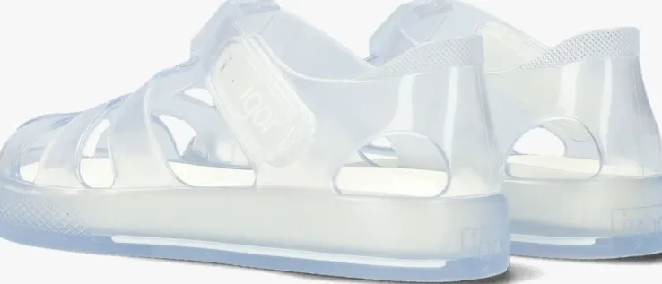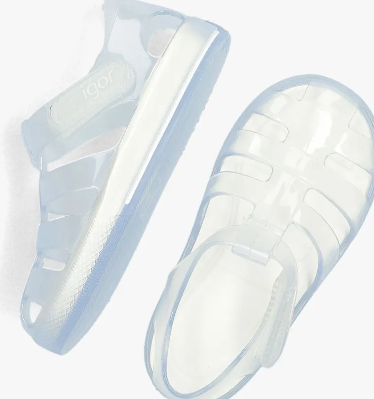Fijne, rubberen waterschoentjes zijn altijd handig! En dit perfecte model STAR CRISTAL van het Spaanse merk Igor ziet er ook nog eens supertof uit! De sandaal is helemaal van rubber en het bovenwerk heeft een licht blauw / transparant uiterlijk. De witte rubberenzool heeft een sportieve look en biedt het nodige comfort aan spelende en veel bewegende voetjes. Met het klittenband zijn ze goed passend te maken en door hetuitneembare voetbed maak je ze ook nog eens heel makkelijk schoon. Doeze lekker aan naar het strand en je kleine rent er zo de zee mee in! Maar ze zijn ook perfect om thuis met water te spelen in de achtertuin.