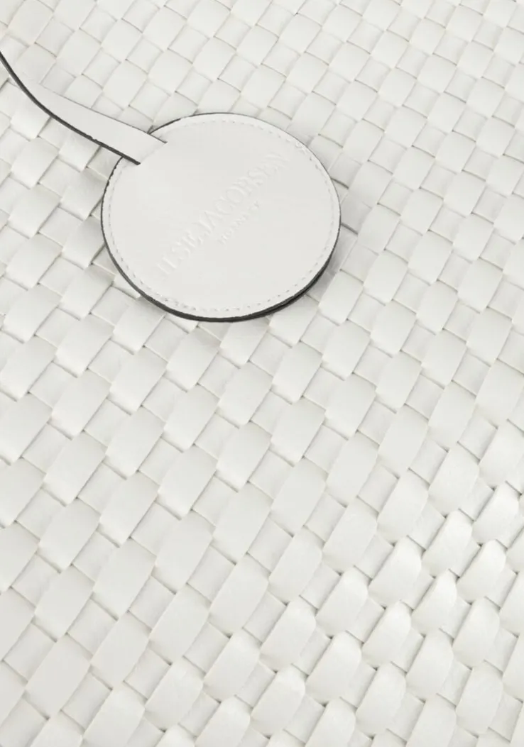 Deze witte schoudertasTOTE BAG08 van het merk Ilse Jacobsen is uitgevoerd in gestructureerd leatherlook met een zomers vlechtwerk en brede schouderbanden van ditzelfde gevlochten leatherlook. De tas is extra leuk omdat hij reversible is, waardoor je ook de zilverkleurige binnenkant naar buiten zou kunnen dragen. Afmetingen: 33 x 15 x 28 centimeter.