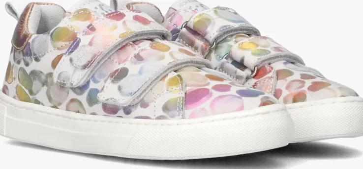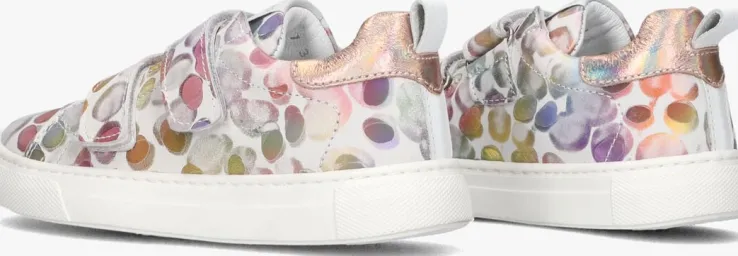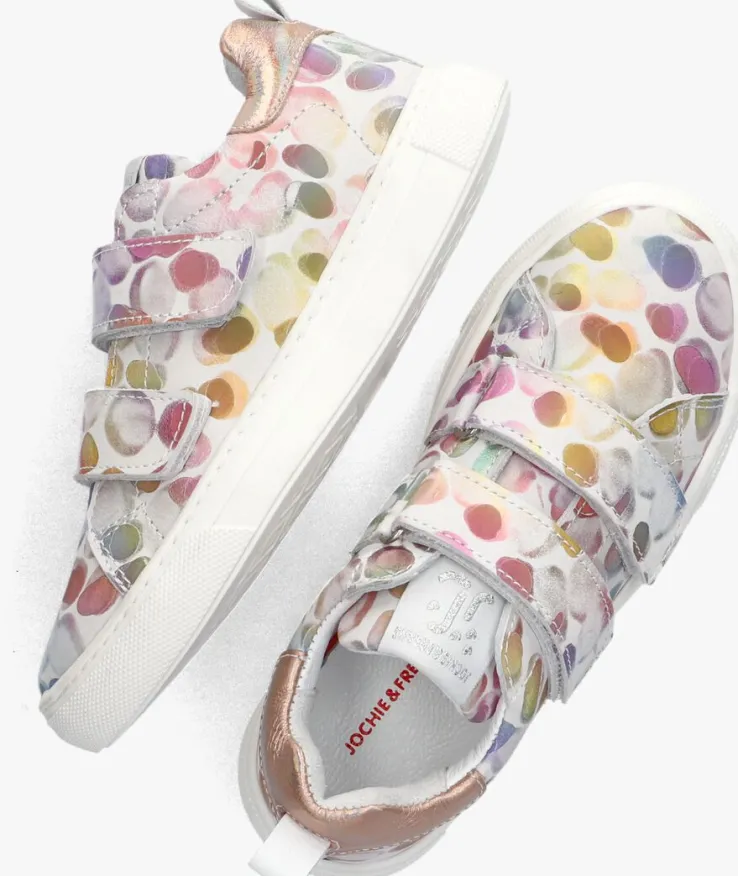 Deze lage sneaker FREAKS V van JOCHIE & FREAKS is gemaakt van wit leer in print van vervaagde rondjes en heeft toffe details. Opvallend is de metallic roze hielcap met aantreklus en het witte stoffen merkembleem op de tong. Je trekt ‘m gemakkelijk aan en uit dankzij de twee klittenbandsluitingen op de wreef en je ervaart extra comfort dankzij de gewatteerde enkelkraag. De voering is gemaakt van wit leer, het voetbed is uitneembaar en het hielstuk bevat suède. De rubberen zool heeft een gripvast profiel en zorgt voor uitstekende steun en stabiliteit!