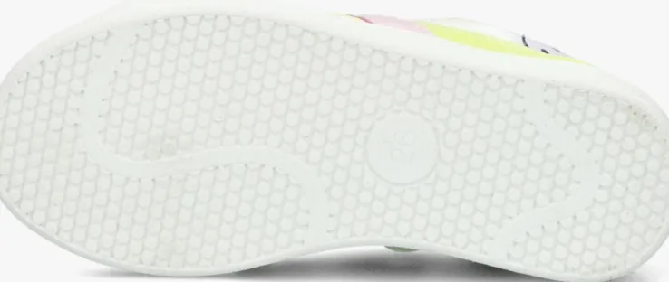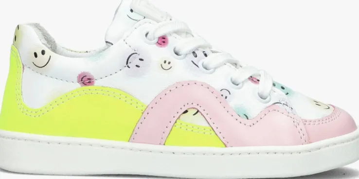 Met deze leuke lage sneakers ZOE uit de collectie van het merk JOCHIE & FREAKS ben je helemaal in de wolken. Bij het zien van deze sneakers word je spontaan vrolijk door de verschillende kleuren en blije smileys op het bovenwerk. Zo heeft de hiel een opvallende neon gele inzet die doorloopt tot op de zijkant en is de neus verstevigd met een roze paneel van leer die ook als een golvende lijn op de zijkant van de sneaker zit. De tong heeft een rubber merkembleem en over het gehele bovenwerk zitten super vrolijke smileys. Het binnenwerk is leer gevoerd en heeft een uitneembaar, dempend voetbed. Dankzij de ritssluiting naast de vetersluiting trek je ‘m gemakkelijk aan en uit en hoef je niet iedere keer de veters te strikken. Het gripvast profiel onder de rubberen zool zorgt voor een goede grip en stabiliteit.