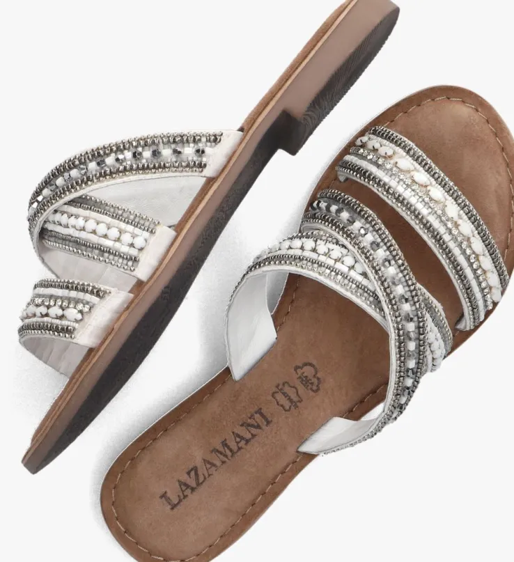 Bij het zien van deze mooie slippers krijg je toch spontaan de zomer in je bol? Deze witte slipper 75.474 van het merk LAZAMANIis uniek, handgemaakt en heeft drie leren banden die chic zijn afgewerkt met zomerse kraaltjes en krassteentjes in de kleuren zilver, grijs en wit, waarvan er twee gekruist over elkaar heen lopen. Het voetbed is gemaakt van bruin suède, heeft een fijne demping en voelt heerlijk zacht aan. Laat de zon maar schijnen!