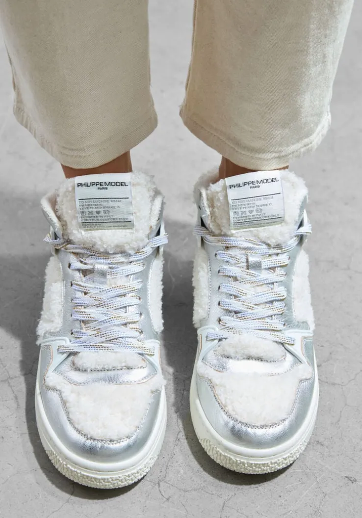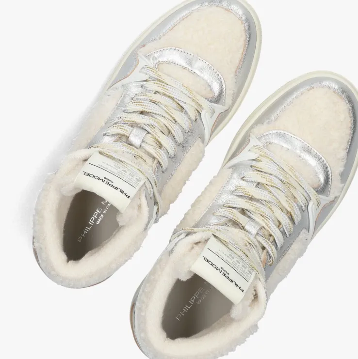 Stap stijlvol de dag in met de LA GRANDE MID WOMAN hoge sneakers van PHILIPPE MODEL. Deze witte pareltjes combineren moeiteloos comfort en fashion. Het bovenwerk bestaat uit teddystof, zilverkleurig leer en wit rubber. Draag ze met een jeans en een oversized trui voor een casual look. De hoogwaardige materialen en het verfijnde design maken deze sneakers een must-have in elke garderobe. Voeg een vleugje luxe toe aan je dagelijkse outfits en geniet van de veelzijdigheid van deze prachtige hoge sneakers.