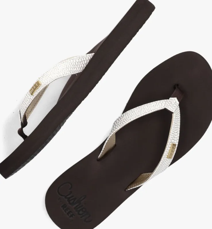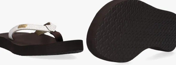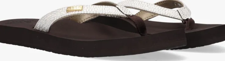 Uit de collectie van het merk Reef is deze zomerse teenslipper STAR CUSHION SASSY. Dit witte model heeft lederlook bandjes met een subtiele reptielenprint en een metallic zilverenfinish. Hetzachte voetbed is van EVA-schuimrubber en heeft een anatomische ondersteuning voor optimaal comfort. De gripvaste rubberen zool loopt naar achteren tot op tot 2 cm. De ideale slipper voor ieder avontuur!
