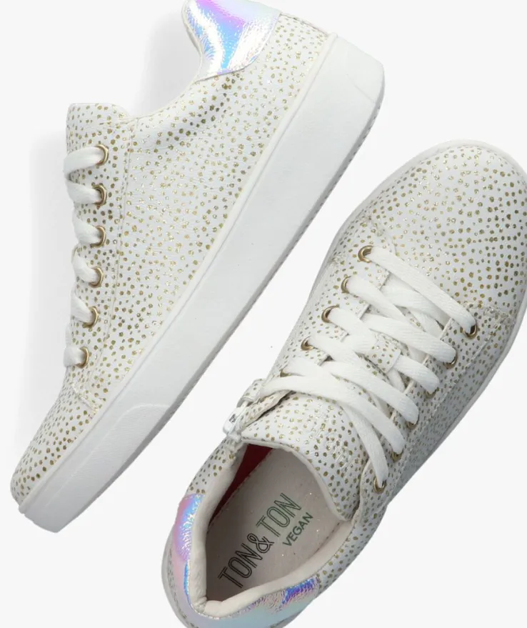 Het merk TON & TON heeft een uitgebreide collectie voor de stoere binken en de hippe meiden. Dit hippe, jonge en trendy merkzorgt ervoor dat opgroeiende kids stevige schoenen kunnen dragen welke gemaakt zijn van soepele materialen zodat kids zorgeloos kunnen ravotten. Met deze glinsterende lage sneaker OM120261 maak jij de blits! De buitenkantis gemaakt van wit vegan leer met een goudkleurige stippenprinten een holografischehielcap. De rubberen zool heeft een strakke vormgeving en is voorzien van een gripvast profiel.Het binnenwerk heeft een leren voering en een uitneembaar voetbed. Dankzij de ritssluiting aan de zijkant van de schoen trek je ‘m gemakkelijk aan en uit en hoef je niet iedere keer de veters te strikken. Voor extra steun en nog meer comfort is de enkelkraag licht gevoerd.