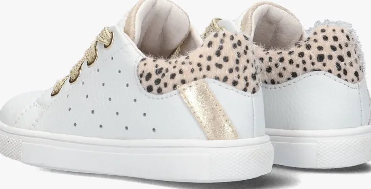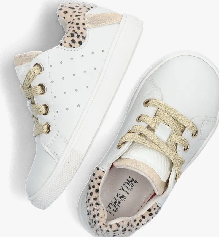 Het merk TON & TON heeft een uitgebreide collectie voor de stoere binken en de hippe meiden. Dit hippe, jonge en trendy merkzorgt ervoor dat opgroeiende kids stevige schoenen kunnen dragen welke gemaakt zijn van soepele materialen zodat kids zorgeloos kunnen ravotten. Deze witte, lage sneaker TARA is gemaakt van witleer met perforaties aan de zijkant van de schoen en een hielcap van ponyhair met stippenprint. Op de tong is een wit mesh opdruk te vinden en de goudkleurige veters maken het helemaal af.Het binnenwerk heeft een leatherlook voering en een uitneembaar, leren voetbed.De rubberen zool is voorzien vaneen gripvast profiel.
