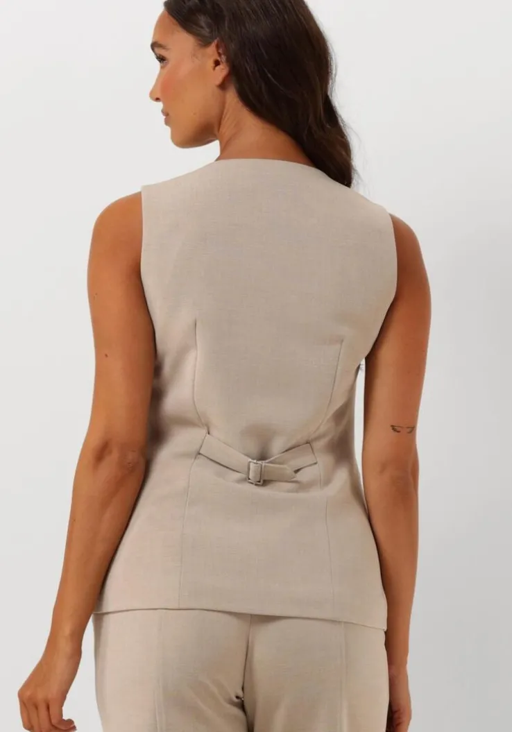 Voeg een vleugje elegantie toe aan je garderobe met het MSCHMIRABELLE MICHELLE VEST van MSCH COPENHAGEN. Deze zandkleurige gilet is perfect voor dames die houden van een stijlvolle, maar toch casual look. Draag het tijdens een zakelijke meeting of een gezellige lunch met vriendinnen. Combineer het met een witte blouse en de bijpassende pantalon voor een chique uitstraling, of ga voor een meer ontspannen look met een basic T-shirt en een rok. De zachte zandkleur maakt het makkelijk te mixen en matchen met verschillende outfits. Een veelzijdig item dat niet mag ontbreken in je kledingkast.