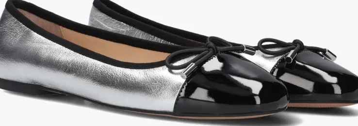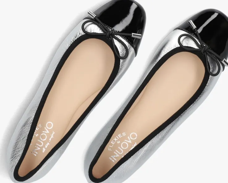 Stap in stijl met deze zilverkleurige ballerina’s van INUOVO. Met de A94001 ben je klaar voor elke gelegenheid. Het bovenwerk bestaat uit leer en de neus is afgewerkt in zwart lakleer met een elastisch strikje. Combineer ze met een zomerse jurk voor een casual look of draag ze onder een nette broek voor een chique uitstraling. Of je nu gaat winkelen of een terrasje pakt, deze ballerina’s maken elke outfit compleet. Comfortabel en trendy, een must-have voor elke dame!