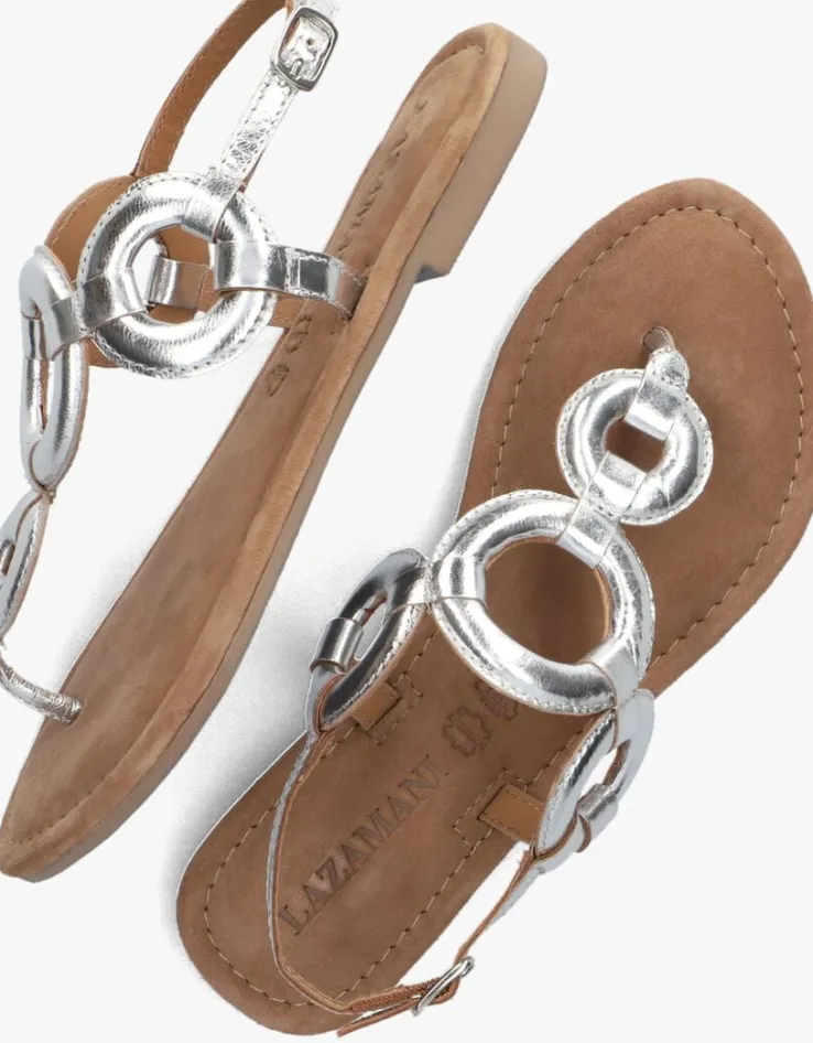 Met sandalen aan je voeten van het merk LAZAMANI ben je verzekerd van eentrendy look in combinatie met een hoog comfortabel gevoel. Alleitems uit de collectie van dit merk zijnvoorzien van een verrassende twist. Dat zie je ook zeker weer terug in deze zilverkleurige sandaal 33.543. Het bovenwerk is gemaakt van glanzend leer en heeft een mooie decoratie van vier gewatteerde rondjes. Het bandje om de enkel is voorzien van een gespsluiting waardoor je ‘m gemakkelijk aan- en uittrekt en de sandaal goed aan je voet blijft zitten. Het binnenwerk is leer gevoerd en de het voetbed met reliëf merkopdruk heeft een fijne suède afwerking met schuimvulling voor een heerlijk zacht en comfortabel gevoel. De rubberen zool is flexibel waardoor hij fijn meebuigt met de voet en is voorzien van een fijn maar gripvast profiel. Een heerlijke sandaal voor allezonnige dagen met een mooie decoratie voor die extra vrolijke touch onder al je outfits!