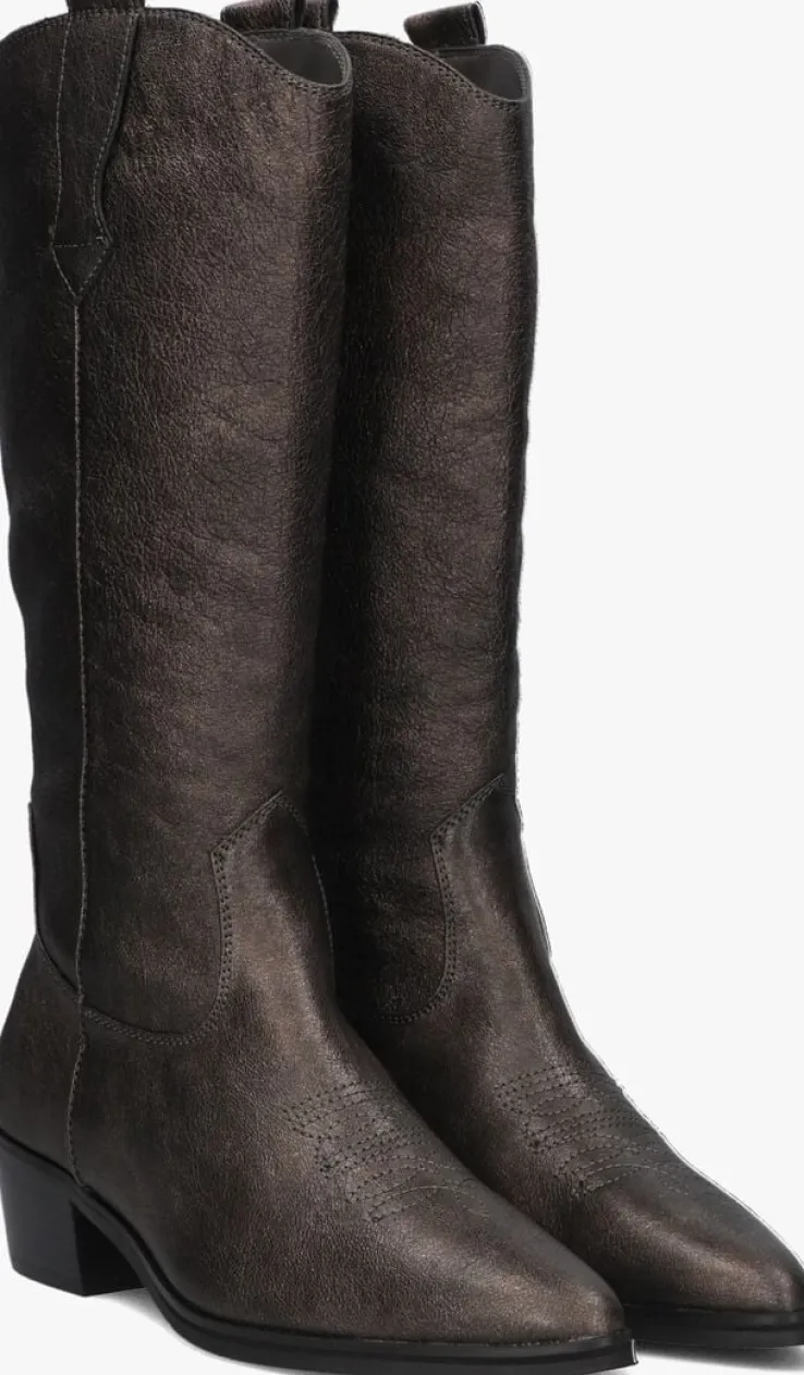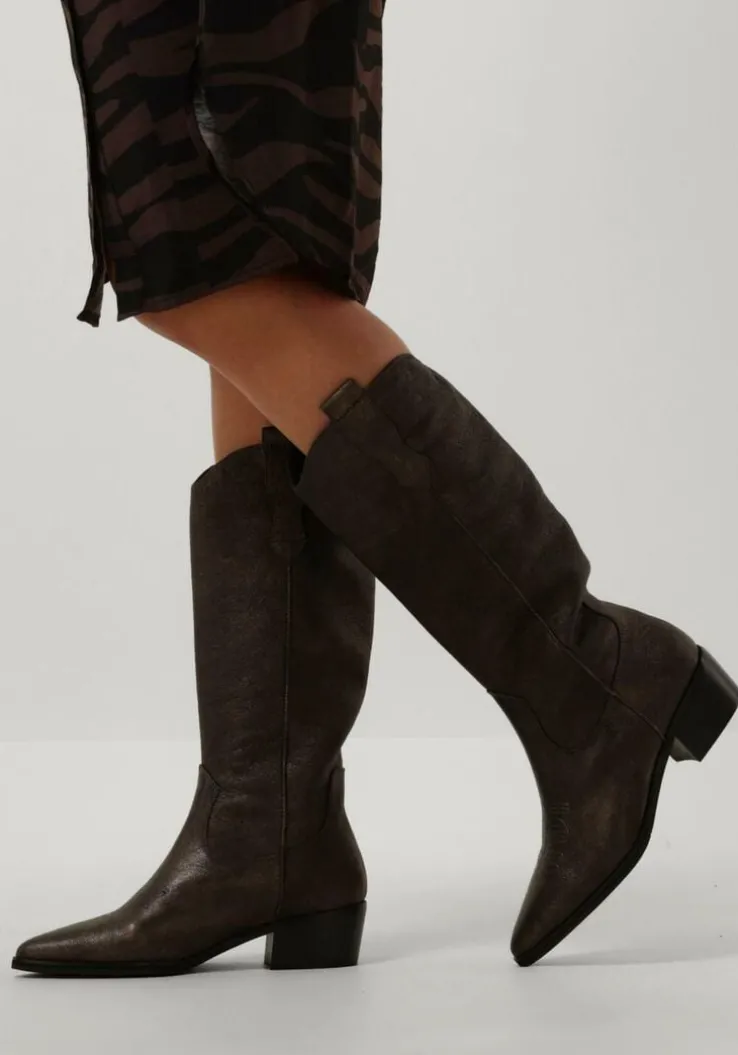 Stap in stijl met de CASSIE-03 cowboylaarzen van NOTRE-V. Deze bruine cowboylaarzen met zilveren glans, zijn echte pareltjes voor dames die willen stralen. Deze prachtige laarzen hebben een comfortabele binnen voering, van zacht textiel en leer. Door zijn puntige neus en speelse stiksel geeft het de laars een stoere look. De cowboy laars heeft een stevige blokhak van 5 centimeter waar je moeiteloos op rondloopt. De laarzen zijn gemakkelijk aan te doen met de aantreklussen. Combineer ze met een stoere spijkerbroek en een oversized blouse voor een trendy look. Of draag ze onder een zwierige jurk voor een vrouwelijke touch. Met de cowboylaarzen ben je altijd on-trend en klaar voor elke gelegenheid. Laat jezelf zien en laat je voeten spreken!