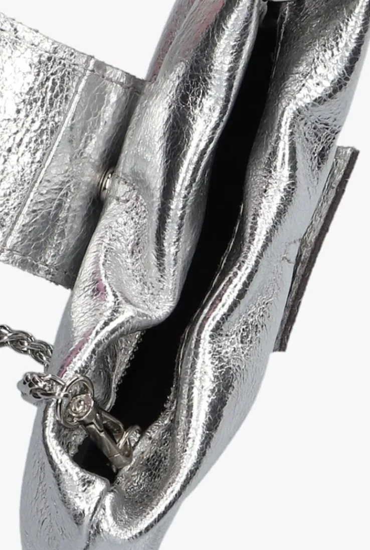 Voeg een vleugje glamour toe aan je outfit met de zilveren BOWI handtas van NOTRE-V. Perfect voor een avondje uit of een chique diner. Deze kleine schoudertas straalt elegantie uit. Combineer met een stijlvolle little black dress of een trendy jumpsuit voor een complete look. De glanzende zilveren kleur zorgt ervoor dat je opvalt, terwijl het tijdloze design moeiteloos bij elke garderobe past. Draag de BOWI over je schouder of in de hand en voel je zelfverzekerd en stijlvol, waar je ook naartoe gaat. Een must-have voor elke modebewuste dame.
