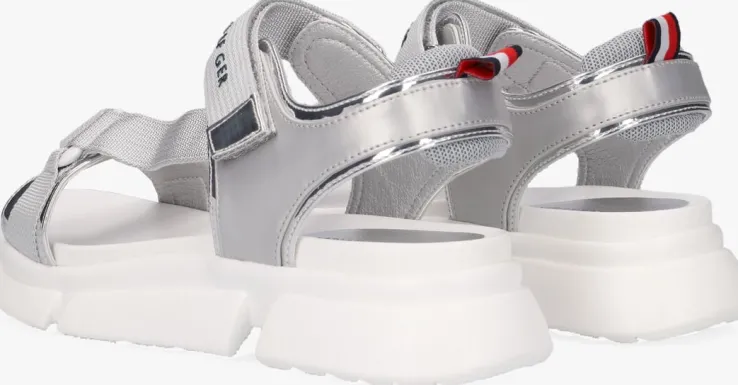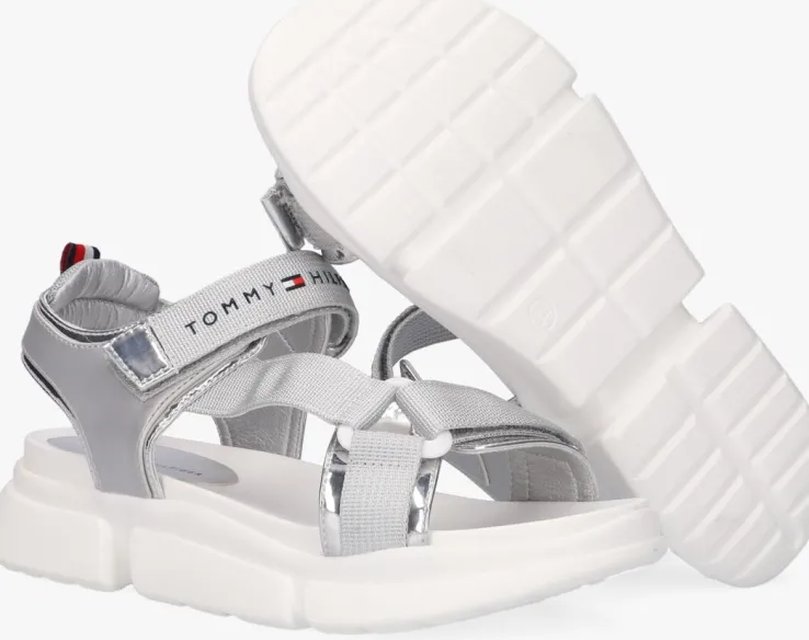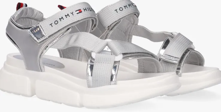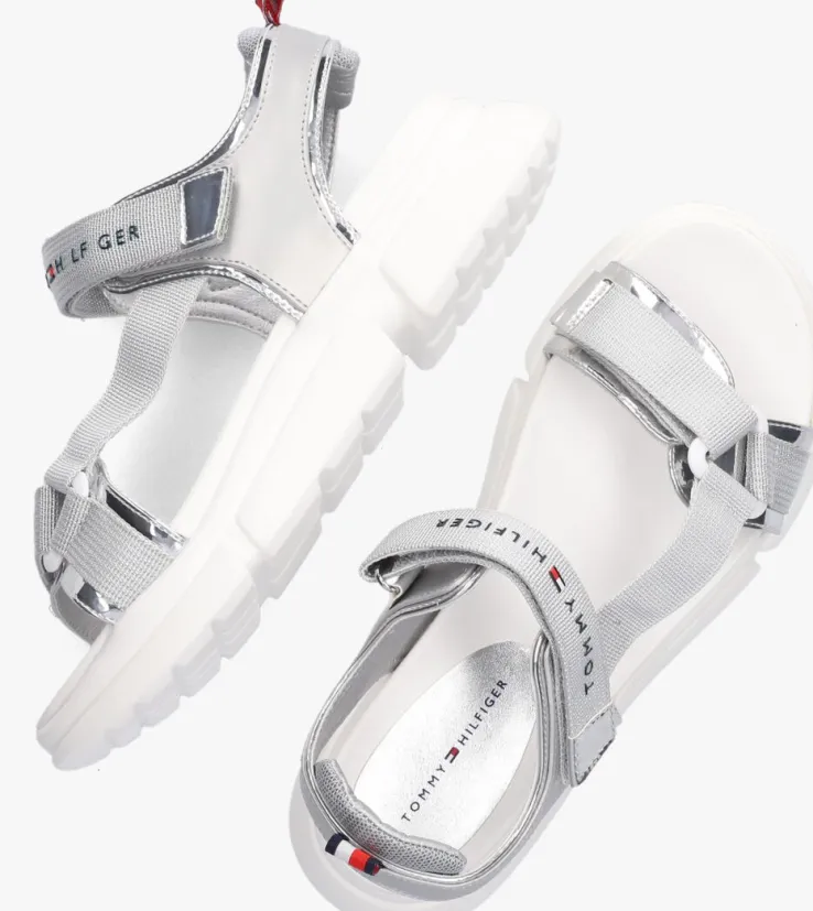 Met deze trendy sandaal 31048van het merk TOMMY HILFIGER straal jij als de zon! De buitenkant is gemaakt van zilverkleurig textiel in combinatie met leatherlook zilveren panelen, biezen en het bandje over de wreef is volledig afgewerkt met een blauwe merkopdruk. Beide bandjes zijn voorzien van een klittenbandsluiting waardoor je ‘m niet alleen gemakkelijk aan- en uittrekt maar ook perfect passend maakt aan de voet. Het binnenwerk is uitgevoerd in lederlook met een comfortabel zacht voetbed en de verdikte rubberen zool heeft een stoere look en een gripvast profiel.