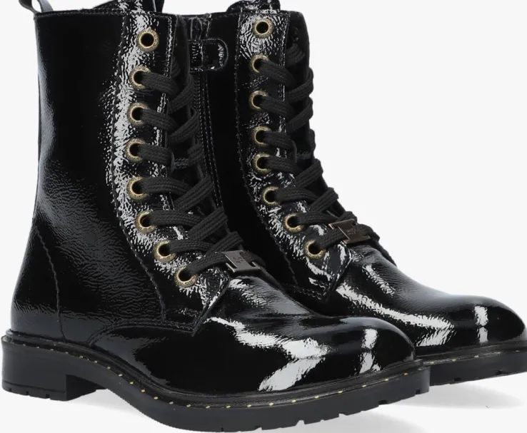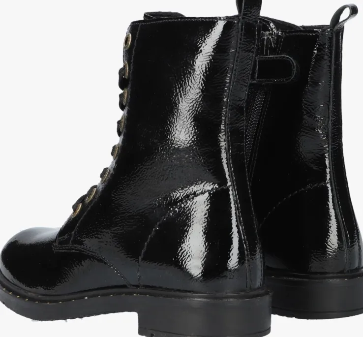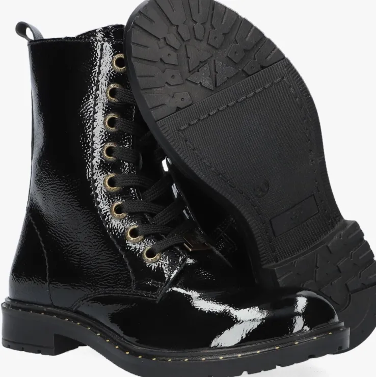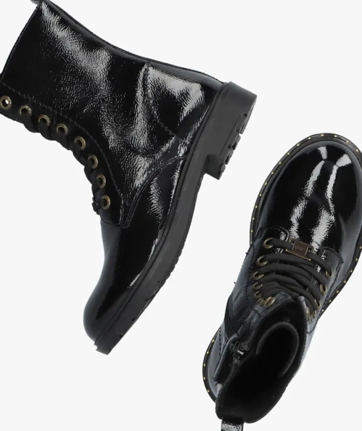 Veterboots zijn niet meer weg te denken uit het straatbeeld en er is genoeg keuze. Deze toffe veterboot B0010451 komt uit de collectie van het merk APPLES & PEARS en heeft een zwart bovenwerk van lakleer. Opvallend zijn de metalen veterringen, de goudkleurig stippen op de zoolrand en de handige aantreklus op de schacht. Het binnenwerk heeft een superzachte en warme textiel voering met een vast voetbed. Dit model heeft naast een vetersluiting ook een ritssluiting waardoor je veel gemak ervaart tijdens het aan- en uittrekken. Het grove profiel onder de rubberen zool benadrukt de stoere look en biedt veel grip en stabiliteit.
