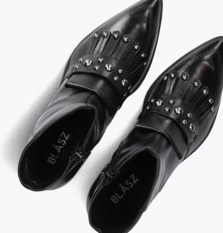 Stap stijlvol de dag in met de L63202 enkellaarzen van BLASZ. Deze zwarte laarzen zijn een must-have voor elke modebewuste dame. Perfect voor een dagje shoppen of een avondje uit. De laars heeft een puntige neus, en een band over de wreef met metalen bollstuds voor een stoere touch. Combineer ze moeiteloos met een strakke jeans of een elegante rok. De glanzende buitenkant geeft elke outfit een chique touch. Voel je zelfverzekerd en trendy, waar je ook gaat. Deze enkellaarzen zijn niet alleen stijlvol, maar ook comfortabel. Voeg een vleugje glamour toe aan je garderobe met de L63202 van BLASZ.