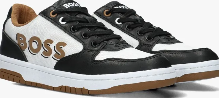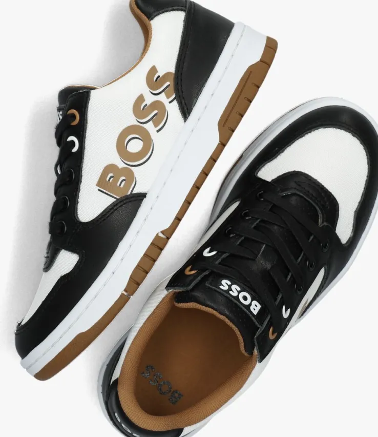 Stap in stijl met de BOSS KIDS BASKETS J50861 lage sneakers in het zwart. Deze stoere schoenen zijn perfect voor jongens die op zoek zijn naar comfort en een trendy uitstraling. Dit model is uitgevoerd in zwart leer in combinatie met wit mesh textiel. Opvallende details zijn de veteringen in de kleur zwart, wit en bruin, de kleine perforaties op de tong, en het merklogo op de zijkant die ook terug te vinden is op de tong en hiel. De binnenvoering is gemaakt van bruin textiel en heeft een uitneembaar voetbed van leer. De witte zool is gemaakt van rubber en heeft een gripvast profiel. Of je nu naar school gaat of met vrienden hangt, met deze sneakers ben je altijd on-point. Laat jezelf zien en rock die BOSS KIDS sneakers!