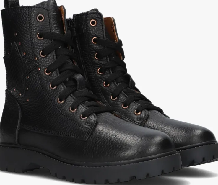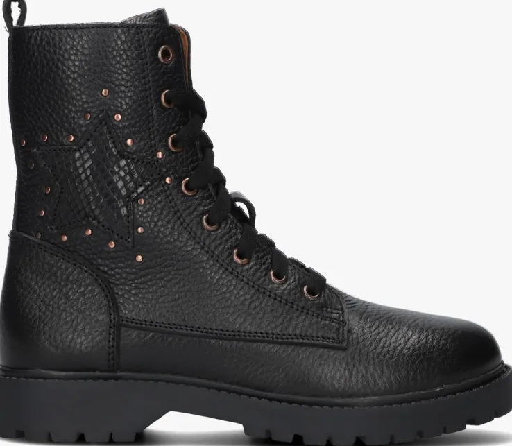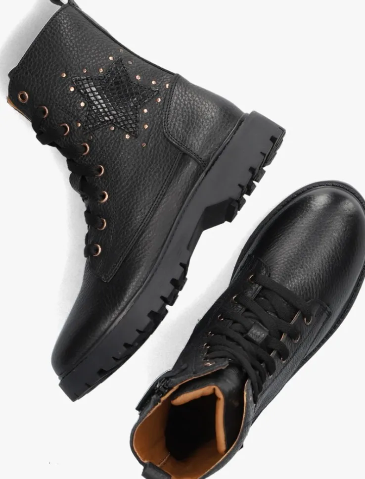 Ontmoet de BETTY BOOT, de perfecte veterboots voor stoere meisjes! Deze zwarte boots zijn gemaakt van hoogwaardig leer en hebben bronskleurige accenten. Met hun chunky zool geven ze elke outfit een trendy touch. Het uitneembare voetbed zorgt voor extra comfort, terwijl de schachthoogte van 16 centimeter zorgt voor een stoere look. Dankzij de handige rits zijn ze gemakkelijk aan en uit te trekken. Op de zijkant prijkt een ster met een omtrek van mini bollstuds. De rubberen zool biedt goede grip en stabiliteit. Combineer deze schoenen met een jeans en een oversized trui voor een coole en casual look. Of draag ze onder een jurkje voor een edgy twist. Met deze boots ben je klaar voor elke avontuurlijke dag!