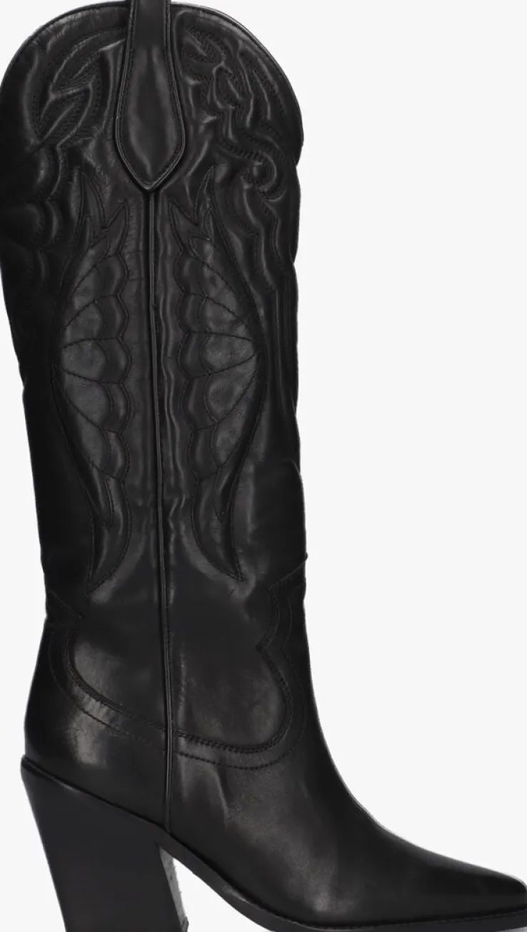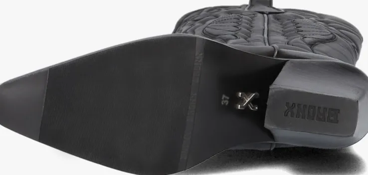 Ga voor een opvallende, stoere look met deze zwarte lange laars NEW-KOLE 14177met toffecowboy-look van het merkBRONX!Dezecowboylaars heefteen afgeronde schacht met aantreklussen en is voorzien van gewatteerde vlammenpanelen en versieringen op de geheleschacht. Daarnaast heeft de laars eenspitse neus eneen stevige, schuin aflopende westernhak. Het bovenwerk is uitgevoerd in glanzend leer en de binnenvoering is van zacht rood leer met een vast voetbed. De rubberen zool geeft de laars een goede grip en de gelaagde hakheeft een hoogte van 9centimeter. Deschacht is 37centimeter hoog en heeft een kuitwijdte van 35 centimeter, gemeten ter hoogte van de kuit. Draag ze ultra feminin met eenrok of jurk of superstoer onder een jeans!