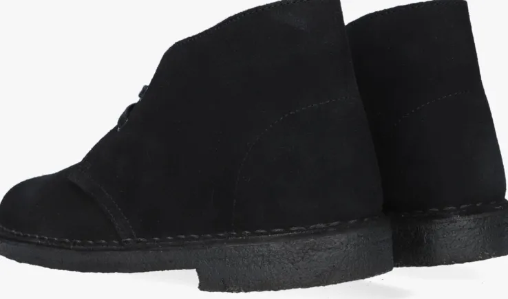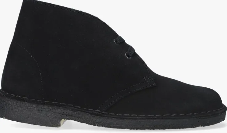 De DESERT BOOT DAMES veterschoen van het merk CLARKS ORIGINALS is alsinds de jaren ’50 een klassieker en heeft nog steeds een ijzersterk silhouet door de eenvoudige lijnen en de bekende crêpe zool. Dit zwarte onovertroffen model heeft een comfortabele pasvorm en is uitgevoerd in zacht suède. De schoen is gevoerd met leer en heeft een vast voetbed. Het getextureerde profiel in de flexibele rubberen crêpe zool heeft de kenmerkende look en biedt grip bij ieder avontuur.De schachthoogte is 10 cm, gemeten bij maat 37.Maatadvies: dit model valt smal, wij adviseren een maatje groter te bestellen.