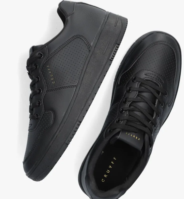 Dit all-black model INDOORROYALuit de collectie van het sportieve merk CRUYFF CLASSICS is gemaakt van lederlook materiaal met verschillende golvende overlays en perforaties. Toffe details zijn de merkopdrukken op de tong, hiel en zijkant. Het binnenwerk is uitgevoerd in textiel en heeft een uitneembaar voetbed. De rubberen zool heeft een merkopdruk op de hiel en een gripvast profiel onder de dikke loopzool.