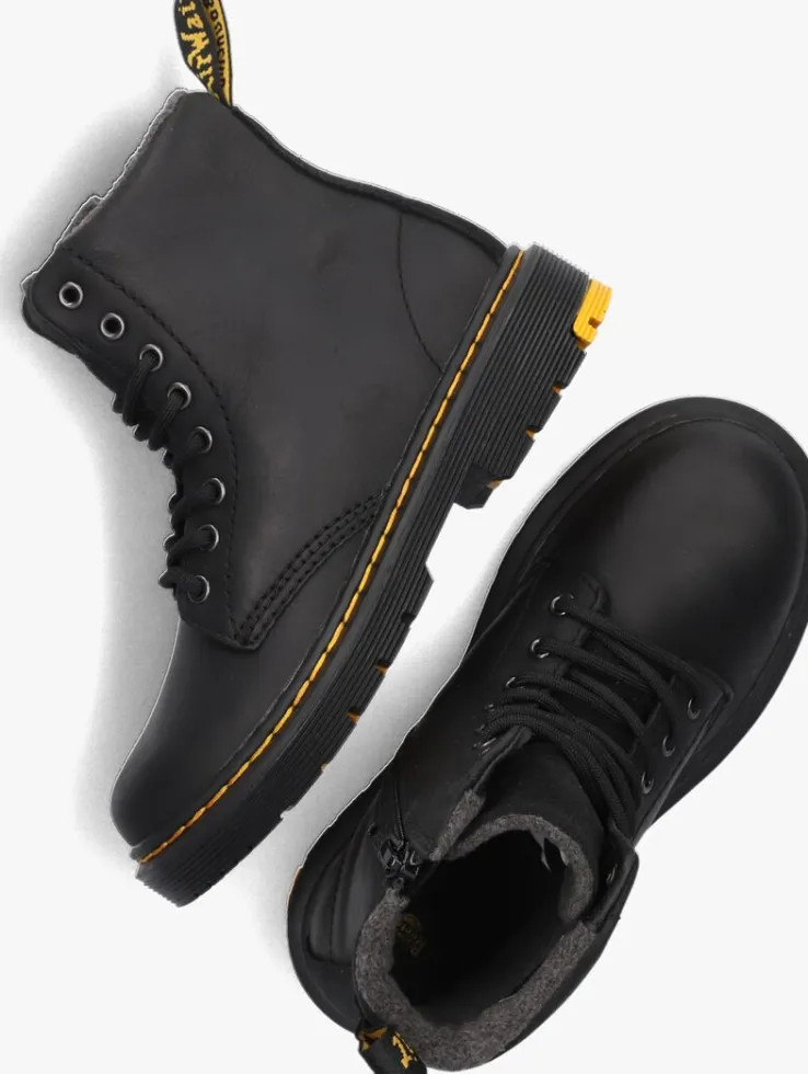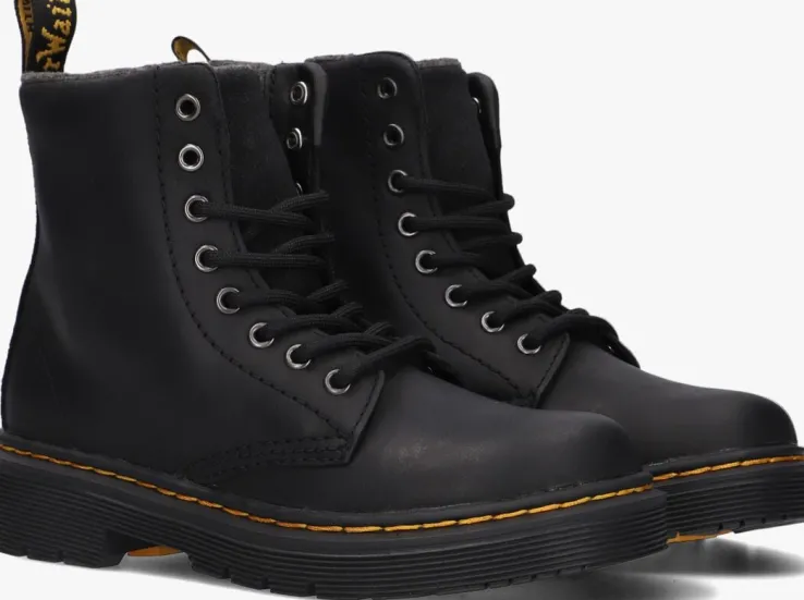 Je bent de grootste rebelop het schoolplein met dezeleren miniversie van de 1460-veterboots van Dr.Martens!Deze zwarte boots 1460 K zijn gemaakt van matterend leer. Delaarzen zijnniet alleen heel stoer en opvallend, maar ook comfy én hip! De veterboots hebben de kenmerkende Dr. Martens-accenten, zoals de zoolrand met groeven, de oversized hiellus, het gele stikselrondom de schoen en de metalen veterogen. De achterkant is afgewerkt met een suèdelook bies. Dit model heeft een handige ritssluiting om ‘m gemakkelijk aan en uit te trekken. Het binnenwerk is uitgevoerd in zacht textiel en heeft een vast voetbed. De schoen is gemaakt om lang mee te gaan en heeft daarom een extraflexibele, verlijmde loopzool, zodat groeiende voeten niet worden belemmerd. Deze rubberen zool is olie- en vetbestendigen biedt een goede schuur- en slipweerstand. *Maatadvies: schoenen van Dr. Martens moeten eerst goed ingelopen worden, maar daarna wil jenooit meer zonder!
