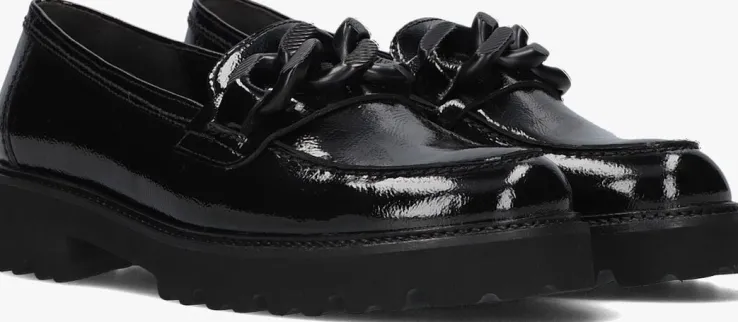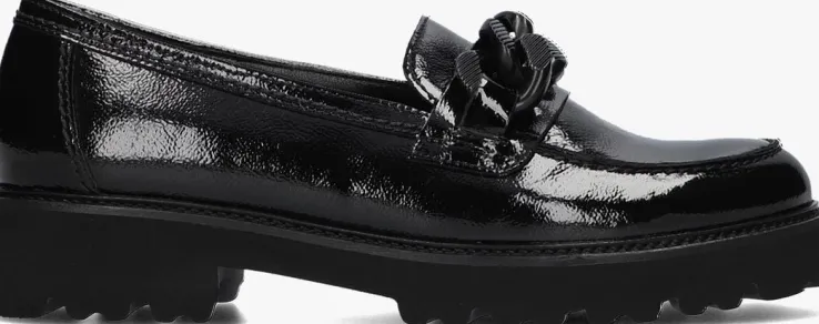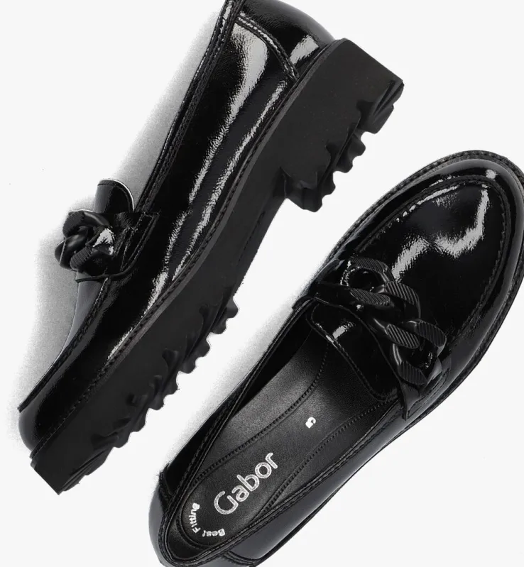 Deze lakzwarte loafer 200.2 met dikke zool komt uit de Best Fitting collectie van het merk Gabor. Schoenen uit de Best Fitting collectie hebben een iets smallere F-wijdte aan de achterkant van de voet, maar ook een breder loopvlak voor extra ruimte op de voorvoet. Daarnaast zorgt deze loafer ervoor dat je de dag comfortabel doorkomt dankzij het leren bovenwerk, het leren binnenwerk en het vaste leren voetbed met dempende werking om de gewrichten te ontzien. Dit model heeft fraaie accenten zoals de dubbele stiksels, de opstaande neusnaad en de goudkleurige schakelketting over de wreef. De zool van lichtgewicht microrubber is uitzonderlijk flexibel en heeft een fraai afgewerkte zoolrand en een golvend profiel in de loopzool. De zool is 2 centimeter dik onder de voorvoet en heeft een hakhoogte van bijna 4 centimeter. Creëer eenvoudig een stijlvolle look onder iedere outfit met deze comfortabele schoen!