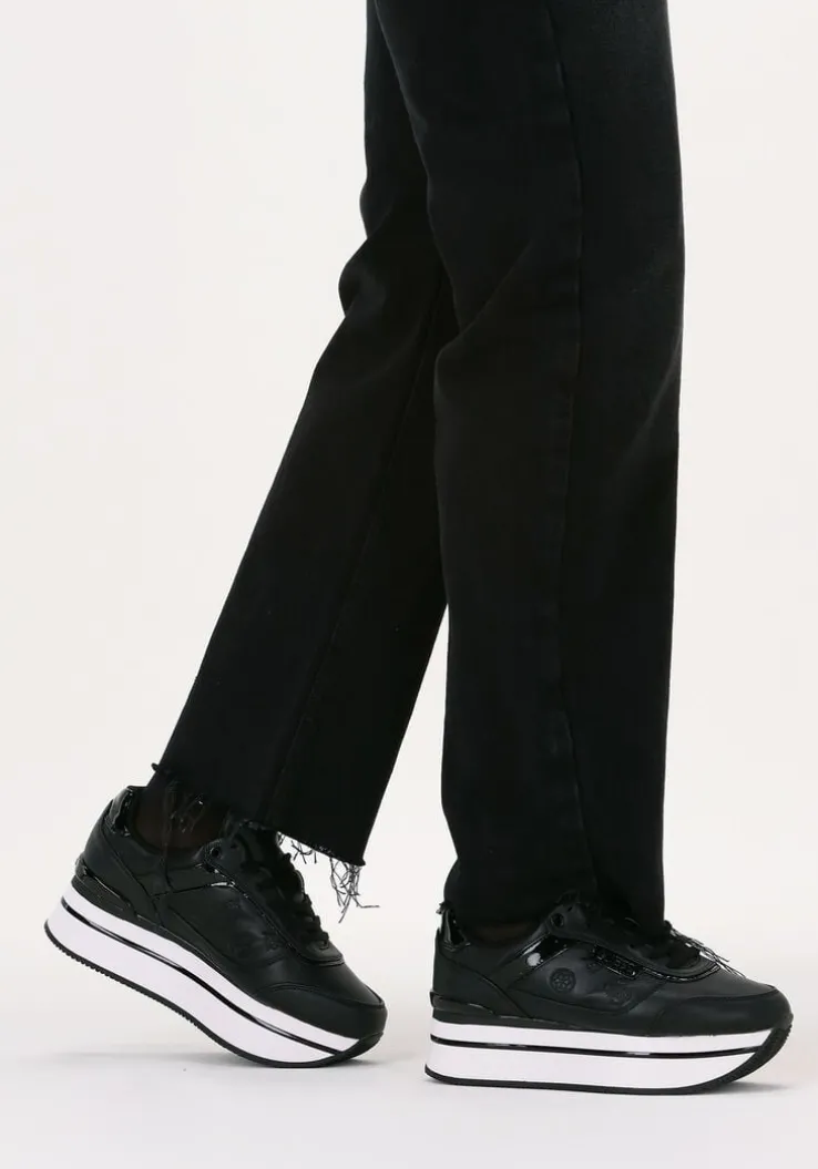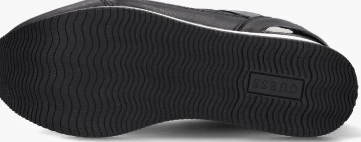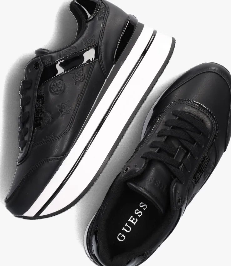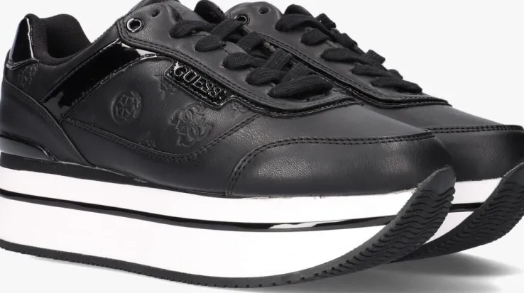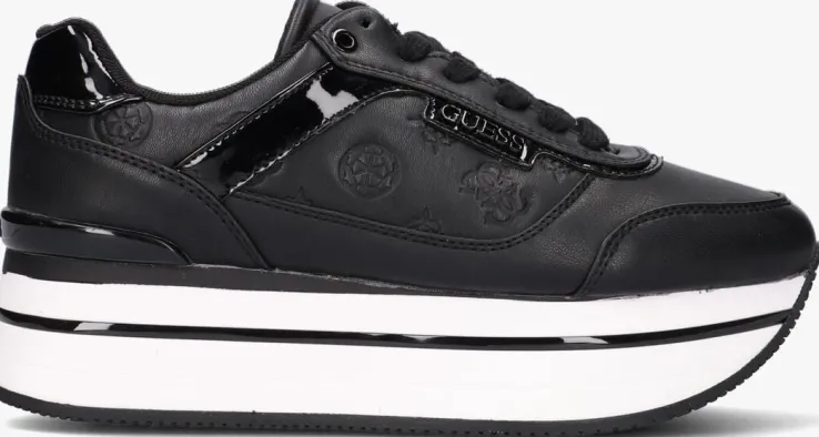 Voeg een trendy-sporty uitstraling toe aan je outfit met deze zwarte platformsneaker HANSIN uit de collectie van GUESS! Het bovenwerk is uitgevoerd in lederlook en heeft een merkopdrukkenprint op de zijpanden en een contrasterende witte zool met zwarte accentstrepen. Merkopdrukken zijn te vinden op de tong, zijkant en hiel en de lak afwerking zorgt voor een shiny finishing touch. Het binnenwerk heeft een voering van mesh met een uitneembaar, dempend voetbed. De lichtgewicht platformzool met zwarte lijnen en zwarte hielstabilisator is 4 centimeter dik onder de voorvoet en heeft een dikte van 6 centimeter onder de hiel. Draag deze toffe sneaker relaxed onder een jeans of nonchalant onder een rokje of jurkje.