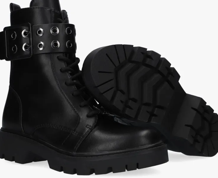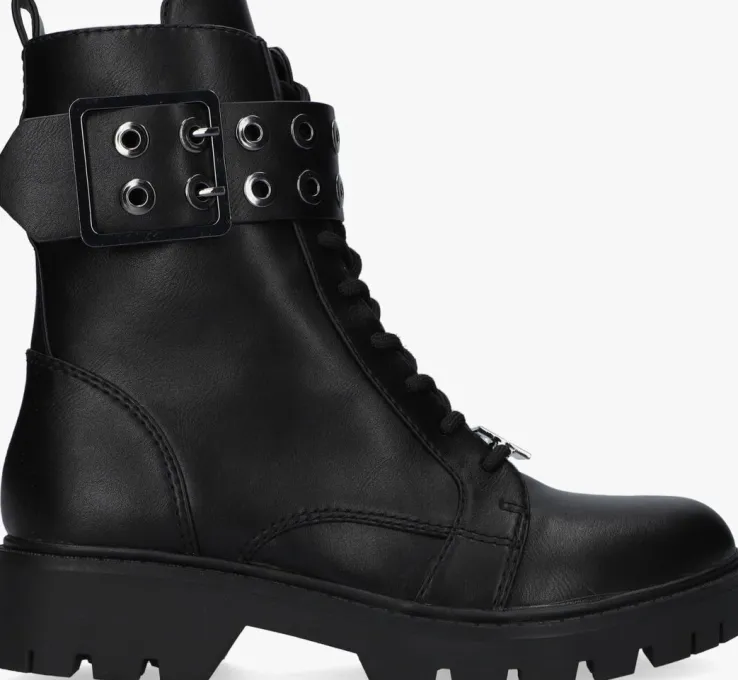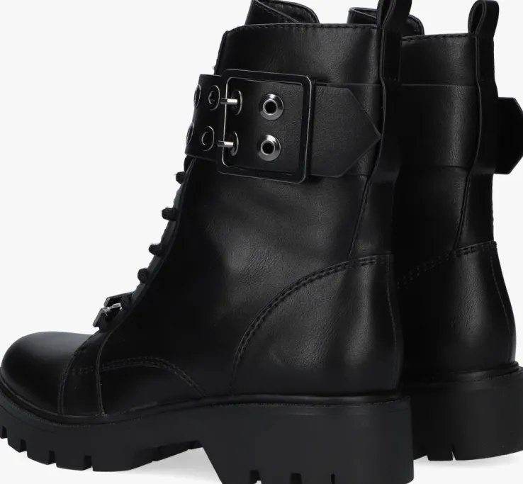 Voeg een beetje glam toe aan je outfit met deze zwarte veterboots RITER uit de collectie van GUESS!Het bovenwerk is uitgevoerd in glad lederlook met opvallende details. Zo heeft de laars een metallic merkembleem op de veters en een gave leatherlook band met metallic gesp en ringen over de vetersluiting heen lopen. De laars heeft ook een handige ritssluiting en samen met de aantreklus is het super makkelijk om ‘m aan en uit te trekken. Extra handig zijn de veters waardoor je de laars gemakkelijk passend kan maken aan je voet. Het binnenwerk heeft een zachte suèdelook voeringmet een vast voetbed. De opvallende zool heeft diepe groeven voor superveel grip. Onder de voorvoet is de laars bijna 2 centimeter hoog en de hakhoogte is 4 centimeter.Draag deze trendy boots relaxedonder een jeans of nonchalant onder een rokje of jurkje.