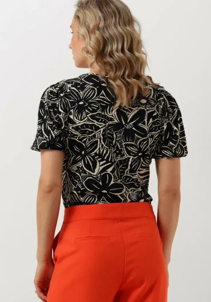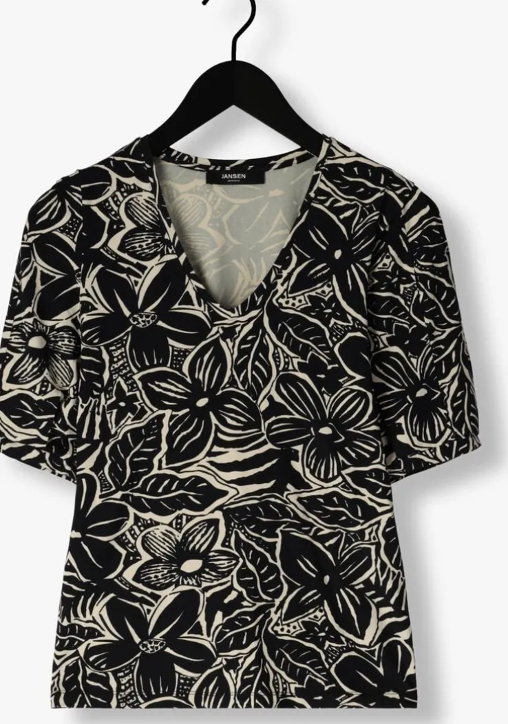 Op zoek naar een stijlvolle toevoeging aan je garderobe? Dan is de VFB179 PRINTED TOP SHORT SLEEVE V-NECK van JANSEN AMSTERDAM perfect voor jou! Deze zwarte top met korte mouwen en V-hals is een must-have voor dames die houden van een trendy look. Draag hem op een mooie jeans voor een casual outfit of combineer hem met een rok voor een chique uitstraling. Of je nu gaat winkelen met vriendinnen of een lunchdate hebt, met deze top zie je er altijd fashionable uit. Maak je look compleet met een paar mooie sneakers of hakken en straal de hele dag door!