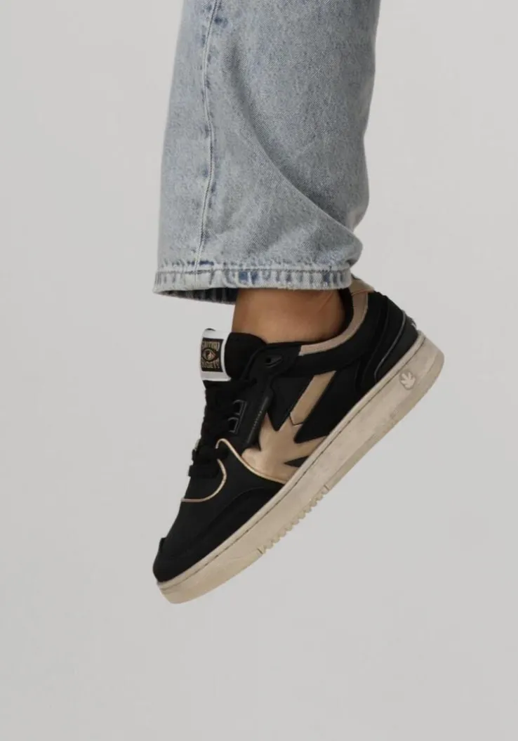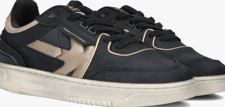 Maak kennis met de BOSTON PIPING METAL lage sneakers van KAOTIKO. Deze zwarte sneakers zijn perfect voor dames die houden van een stoere, maar stijlvolle look. Het bovenwerk bestaat donkerblauw nubuckleer met panelen van goudkleurig leer. Draag ze tijdens een ontspannen stadswandeling of een dagje shoppen met vriendinnen. De metallic details geven een subtiele glans, waardoor je outfit net dat beetje extra krijgt. Comfort en stijl gaan hand in hand met deze veelzijdige sneakers. De rubberen zool heeft een used-look voor een stoere touch.