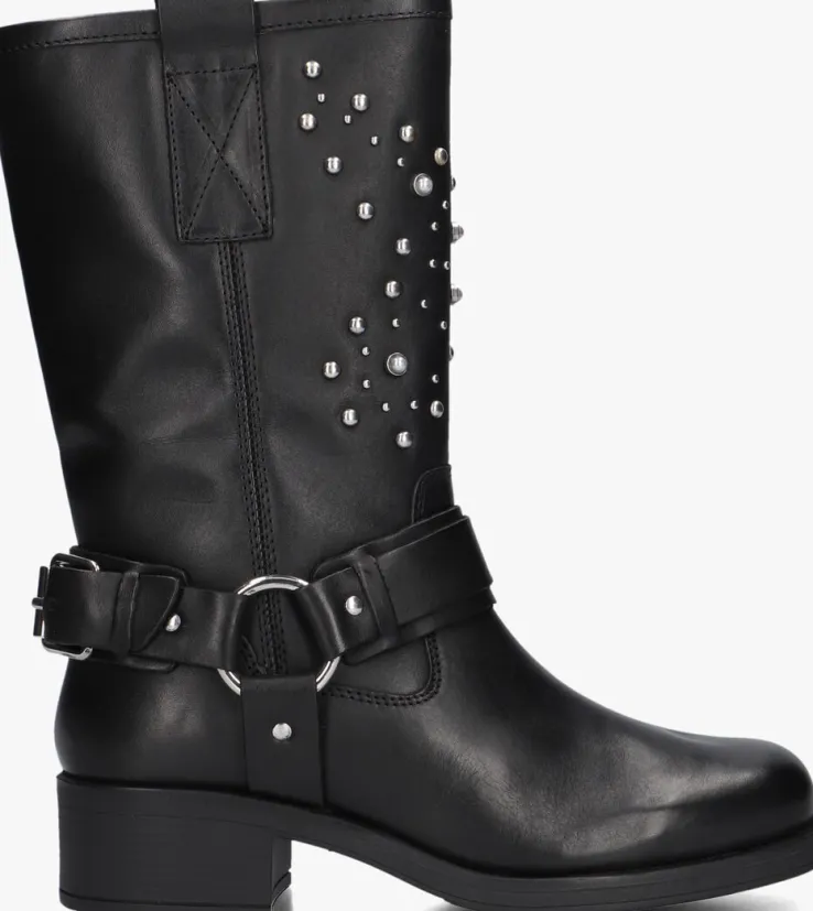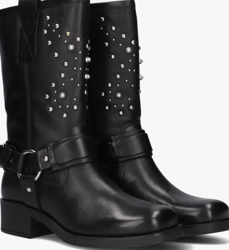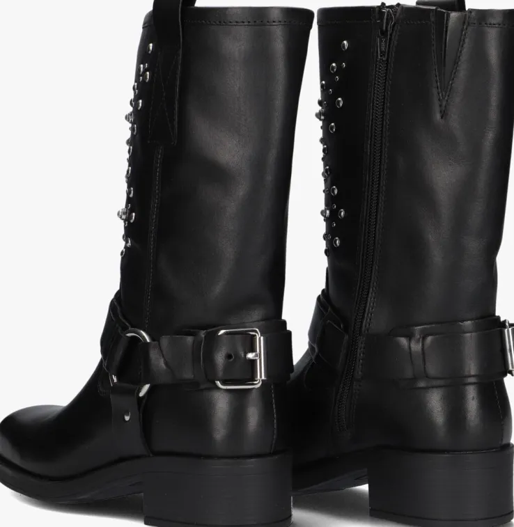 Halfhoge laars met studs voor dames van het merk Lina Locchi. Deze laars met rechte neus is uitgevoerd in zwart leer. De binnenzijde van de schacht bevat een rits om het aan- en uittrekken te versoepelen. De schoen wordt gesierd met een riem met gesp en studs op de voorzijde van de laars. De binnenzijde is uitgevoerd in leer en een stevig contrefort draagt bij aan het loopgemak. De rubberen loopzool heeft een medium profiel voor stevige grip.