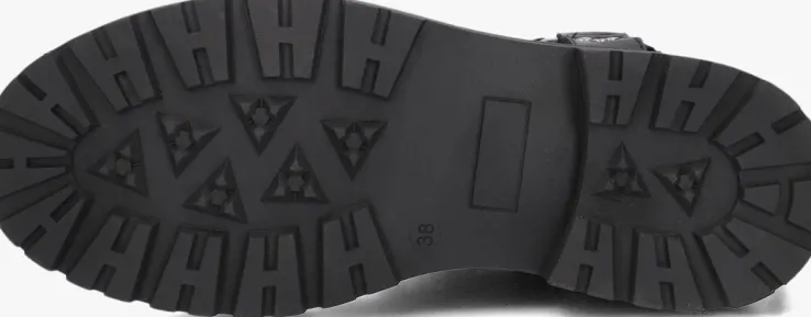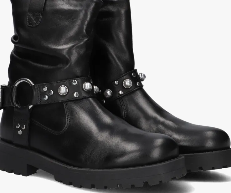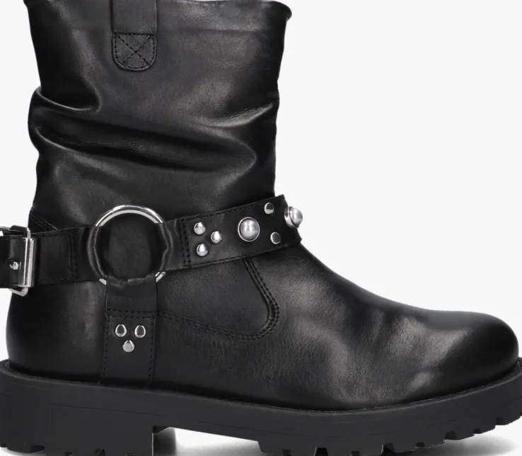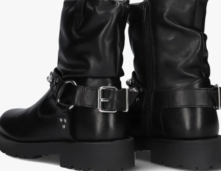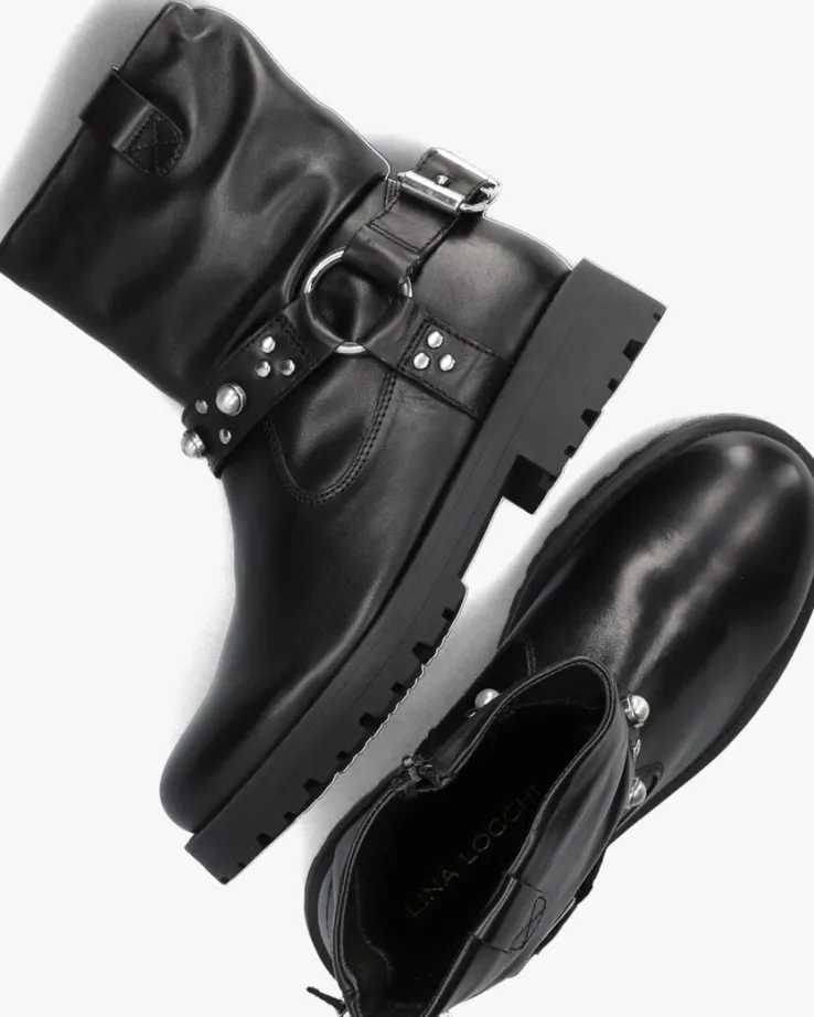 Deze enkellaars met ronde neus is uitgevoerd in zwart leer. De binnenzijde van de schacht bevat een rits om het aan- en uittrekken te versoepelen. De schoen wordt gesierd met een riem met gesp en studs. De binnenzijde is uitgevoerd in leer en een stevig contrefort draagt bij aan het loopgemak. De rubberen loopzool heeft een grof profiel voor stevige grip.