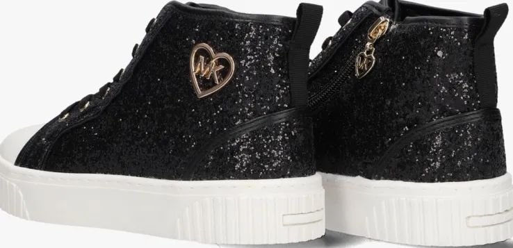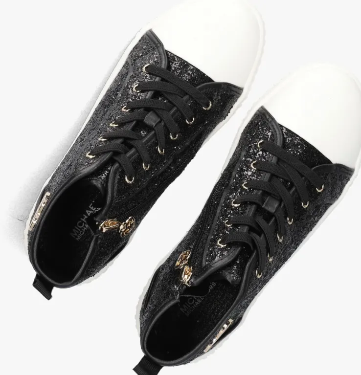 Maak kennis met de SKATE SPLIT 3 GLITTER hoge sneakers van MICHAEL KORS KIDS. Deze zwarte sneakers hebben een toffe glitterprint in een zwarte kleur met een neus in wit leatherlook. Opvallend zijn de goudkleurige veterringen, de zwarte aantreklus en het goudkleurige hartje aan de zijkant. De ronde neus en stevige rubberen zool zorgen voor extra comfort en grip tijdens het spelen en skaten. Dankzij de handige rits trek je ze makkelijk aan en uit. Combineer deze sneakers met een trendy jeans of een sportieve legging voor een coole look. Ideaal voor een dagje uit of een middag in het park. Voeg een vleugje glitter en glamour toe aan elke outfit!