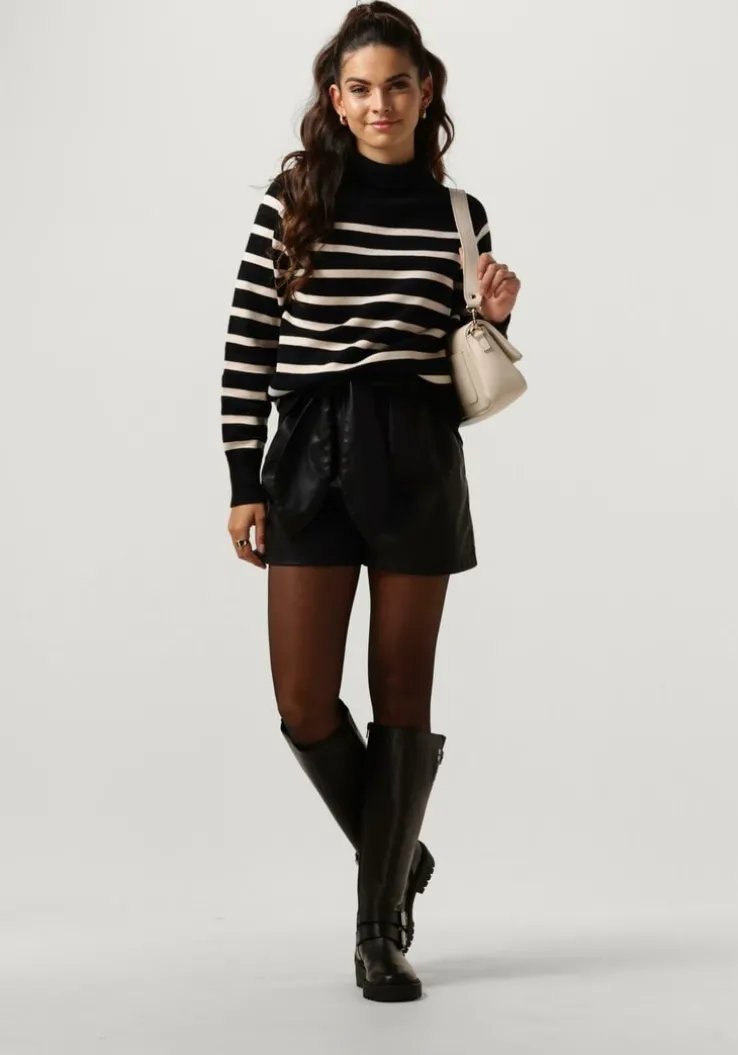 Met de STRIPE KNIT SWEATER van NOTRE-V ben jij helemaal on-trend! Deze zwarte coltrui is gemaakt van viscose en perfect voor dames die houden van stijl en comfort. Combineer deze trui met een mooie jeans voor een casual look, of draag hem met een rok voor een chique uitstraling. Of je nu een dagje gaat shoppen of gezellig uit eten gaat, met deze trui zie jij er altijd fashionable uit. Voeg de trui toe aan je kledingcollectie en maak elke outfit compleet!