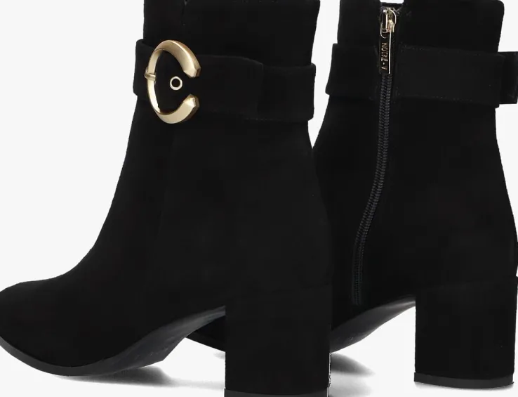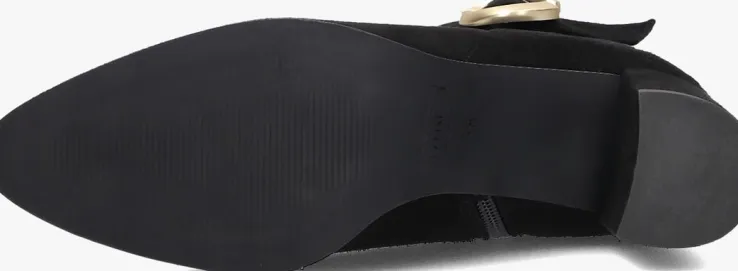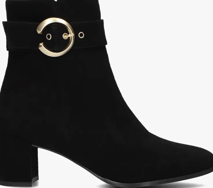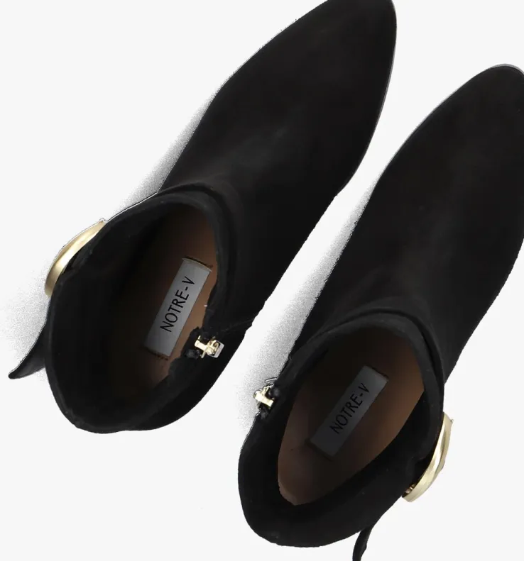 Stap stijlvol de dag in met de zwarte enkellaarzen 8552 van NOTRE-V. Deze elegante schoenen zijn perfect voor een dag op kantoor of een avondje uit. Het bovenwerk bestaat uit zwart suéde met een goudkleurige siergesp rondom de schacht. Combineer ze moeiteloos met een jeans of een chique rok voor een verfijnde look. De zachte buitenkant geeft een luxe uitstraling, terwijl de stevige blokhak zorgt voor comfort en stabiliteit. Of je nu een zakelijke meeting hebt of een diner met vrienden, deze enkellaarzen zijn jouw go-to keuze. Voeg een vleugje klasse toe aan je garderobe met deze veelzijdige en tijdloze schoenen.